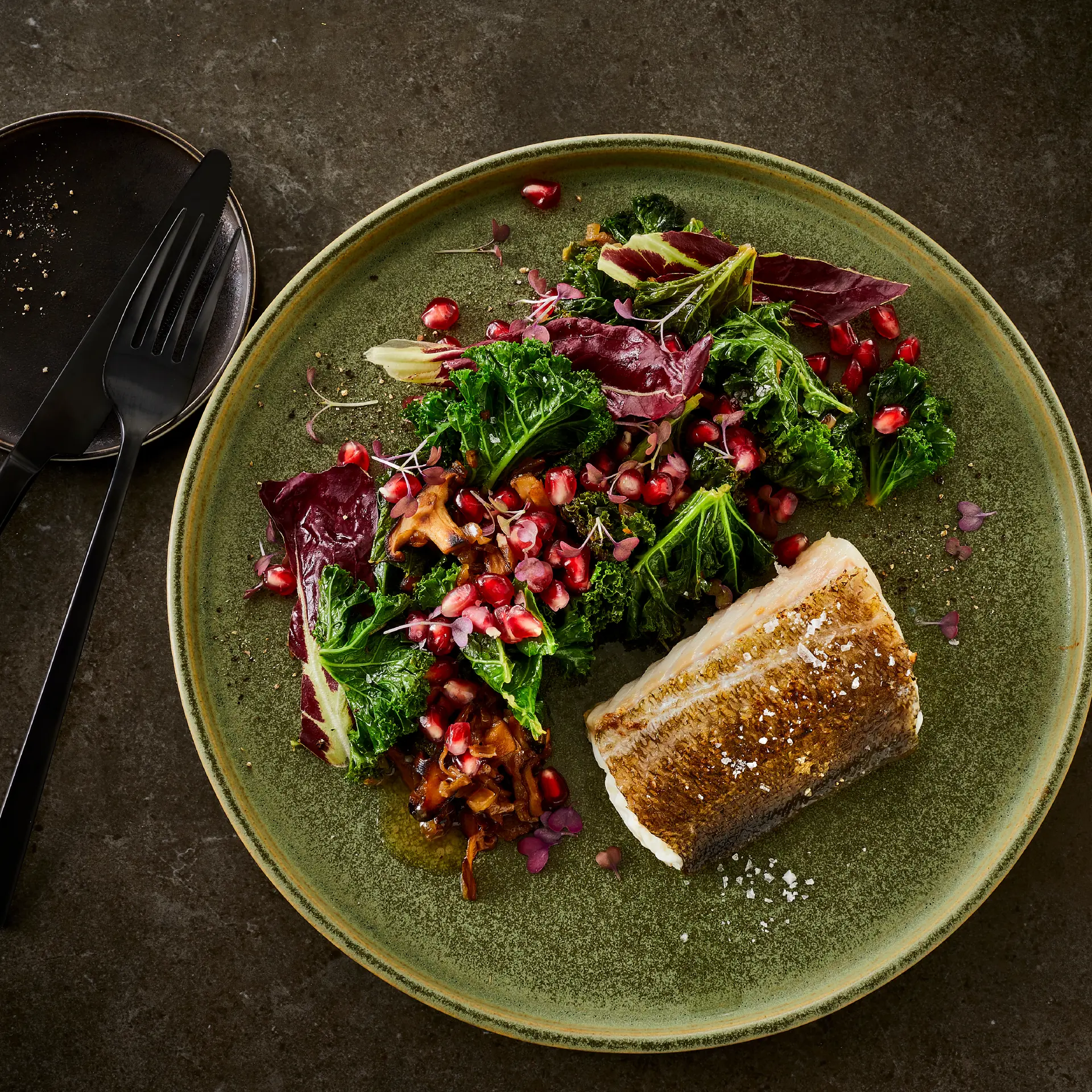 Skindstegt torskeryg på saute af grønkål, svampe og granatæbler