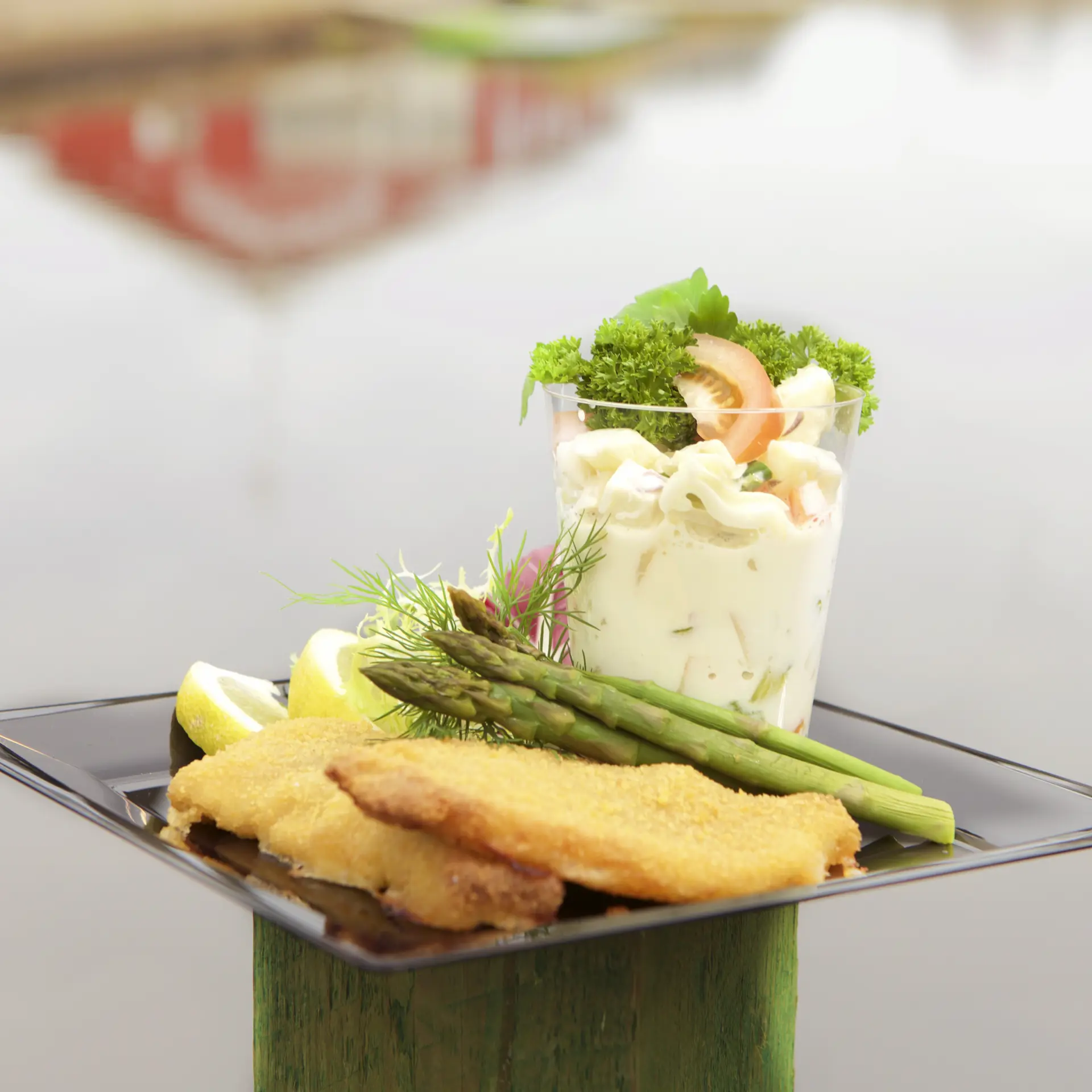 Stegt rødspætte og dampet laks med håndpillede rejer, grønne asparges, tomatmayonnaise og strimler af røget laks