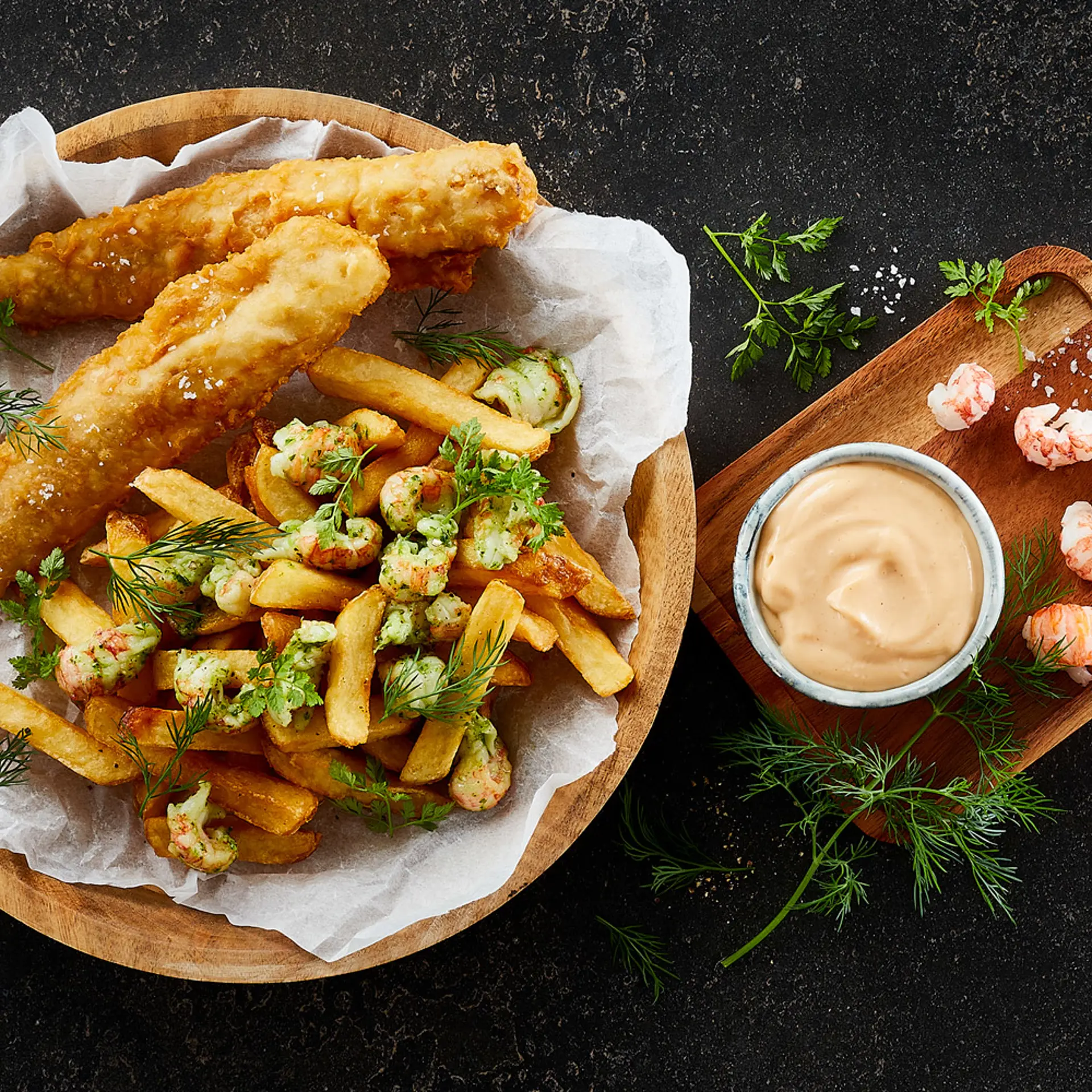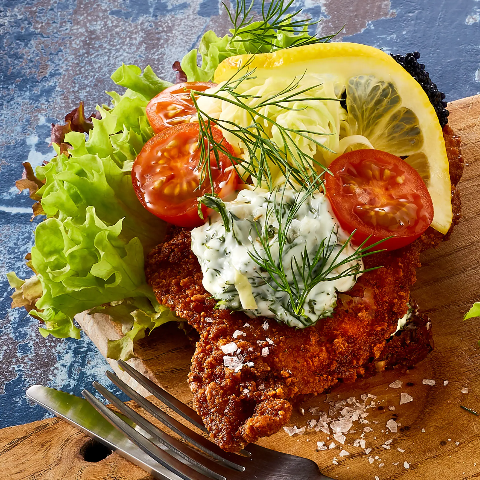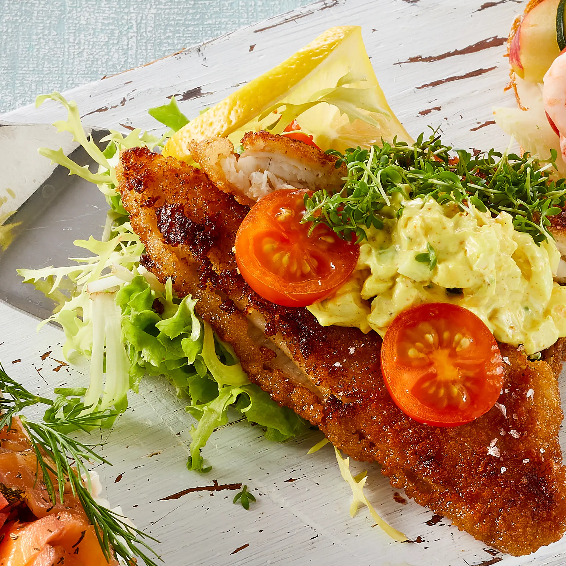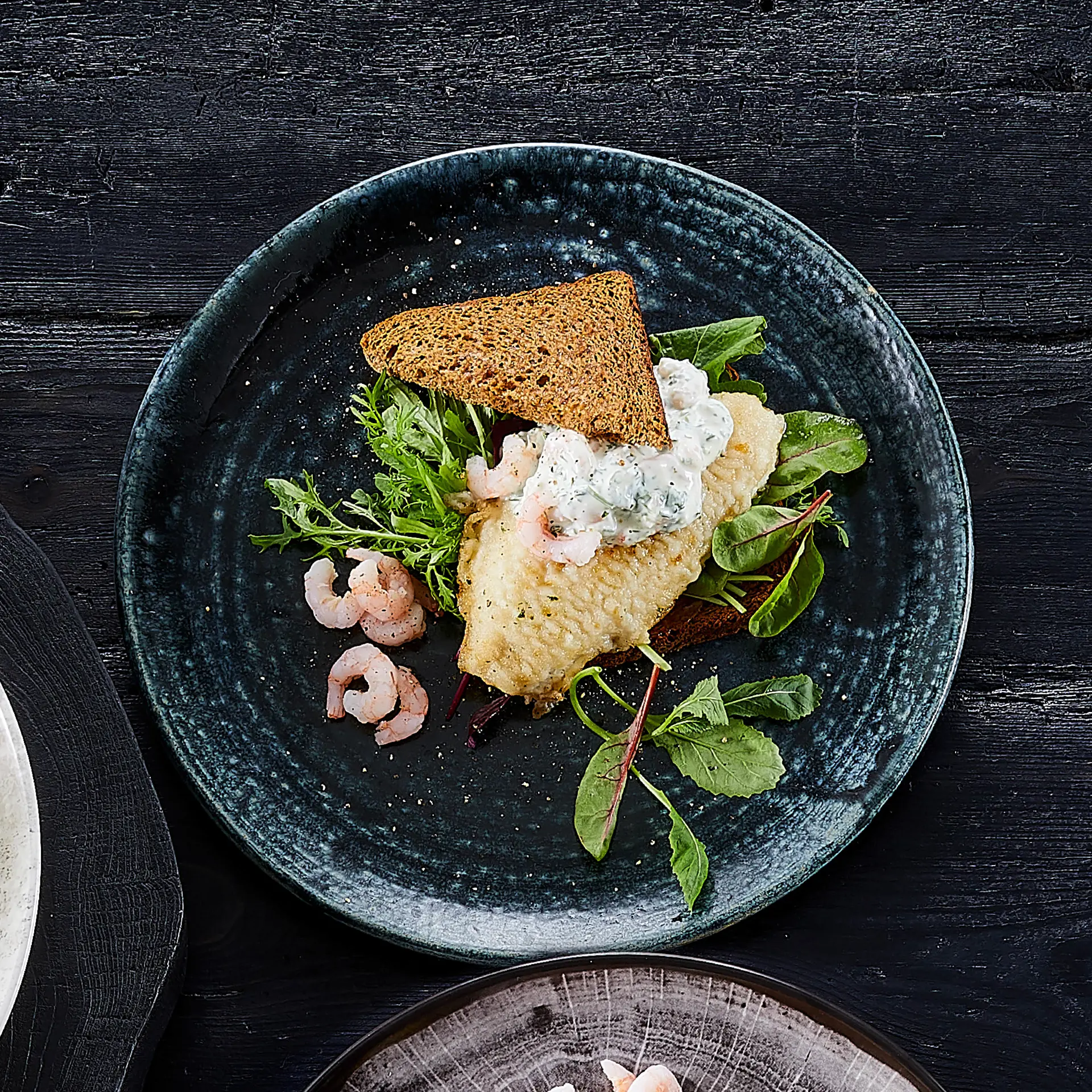 Læs opskrift : Grov trekantsandwich med persillestegt fisk og syrlig rejesalat