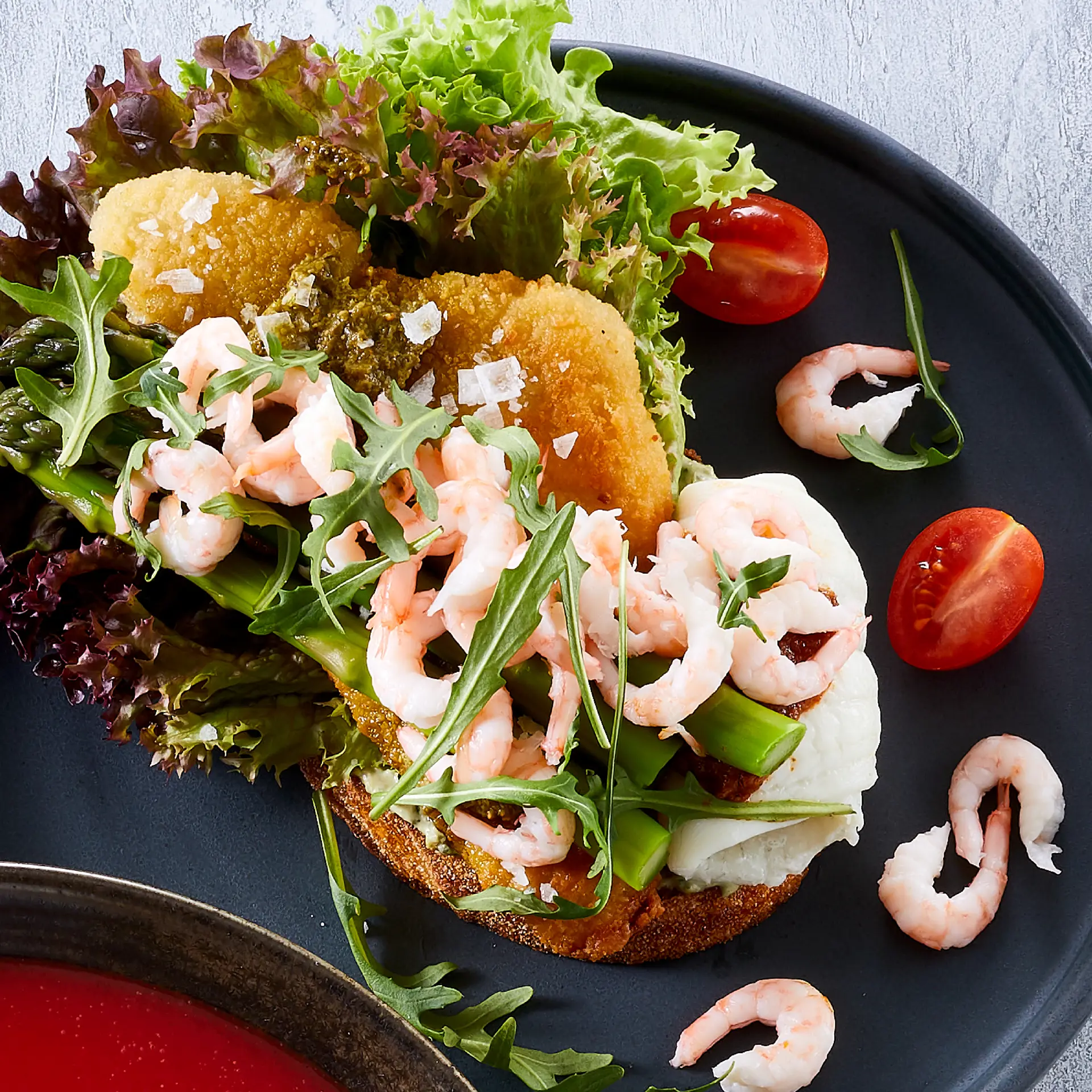 Grov rødspætteburger med rejer, citronmayonnaise og grønsagssalat