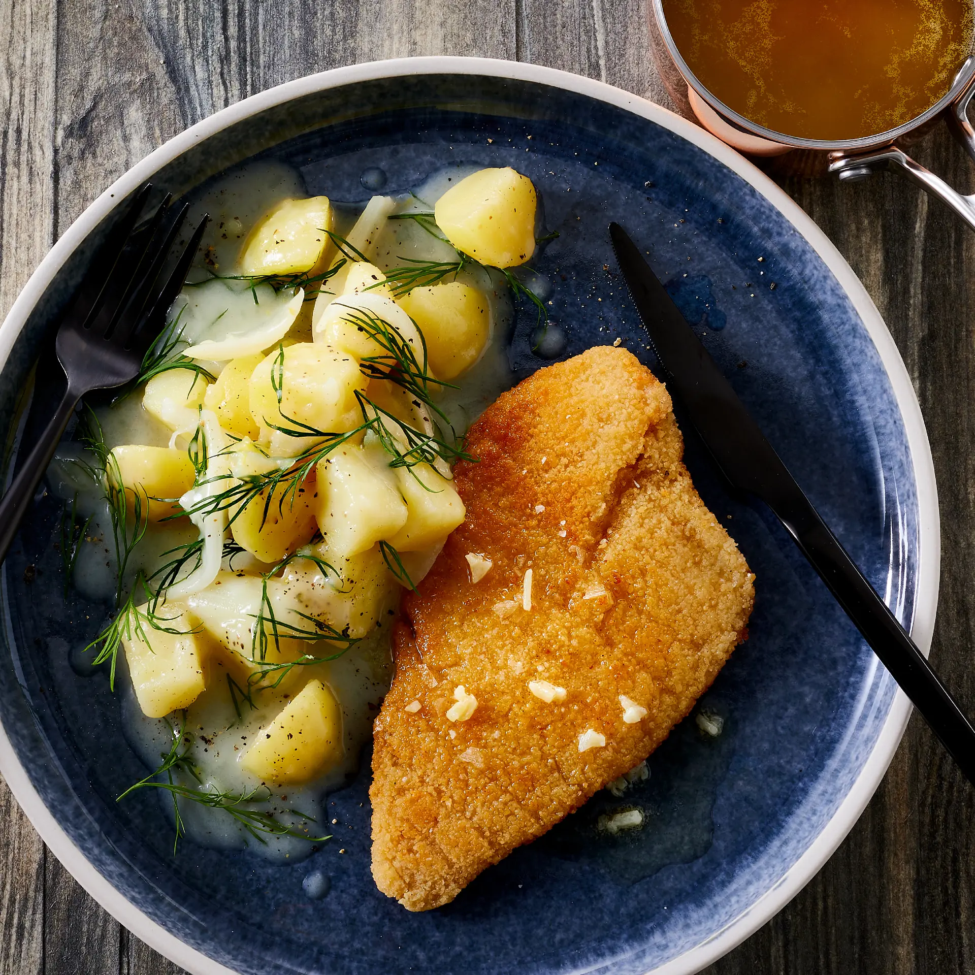 Læs opskrift : Stegte rødspættefileter med varm kartoffelsalat med strejf af citron, overflod af dild og flydende hvidløgssmør