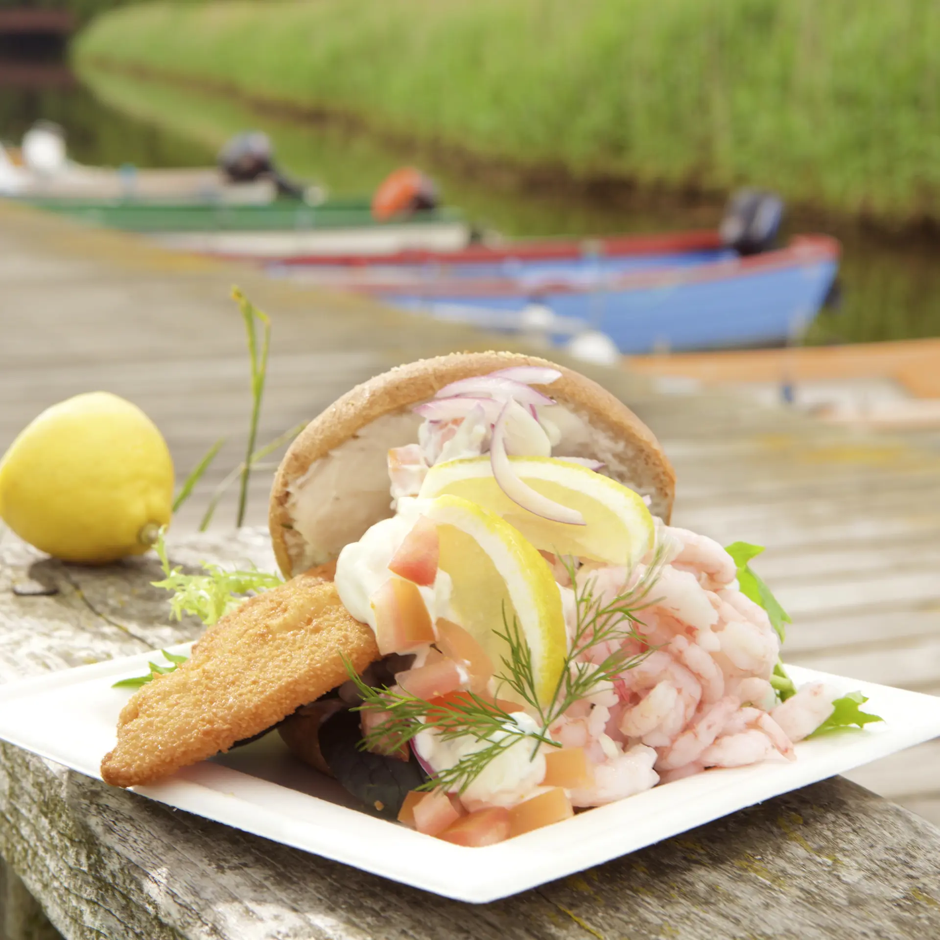 Grov trekantsandwich med persillestegt fisk og syrlig rejesalat