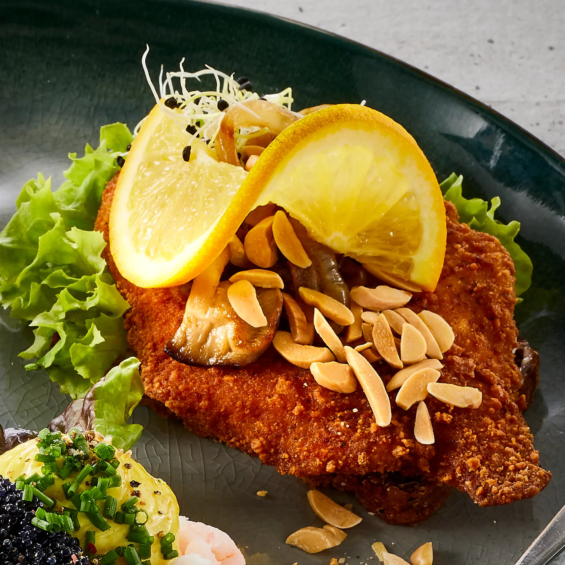 Isingfilet med sammenkomst af stegte løg og svampe samt mandler