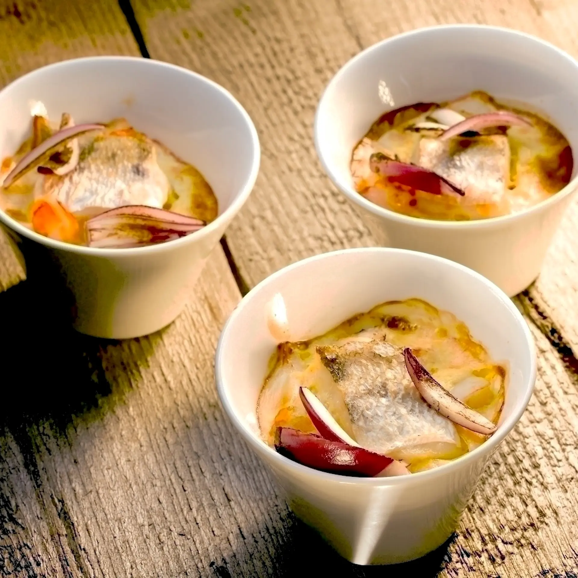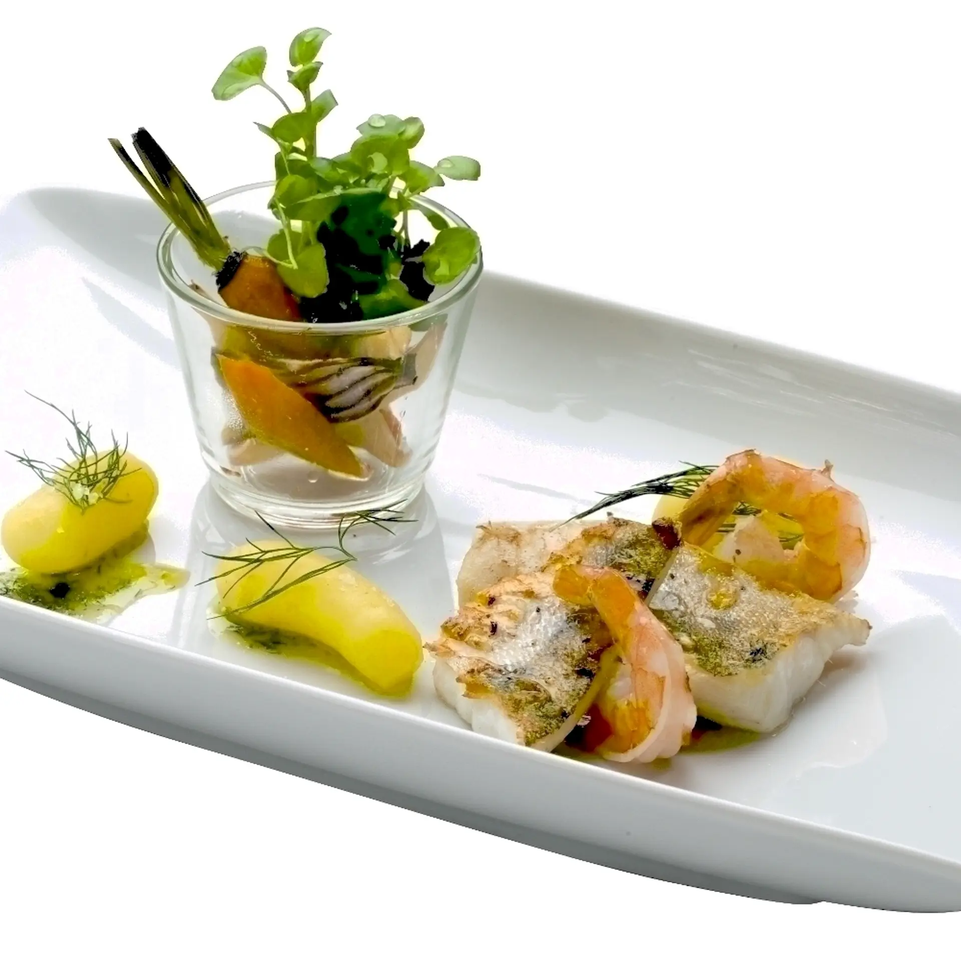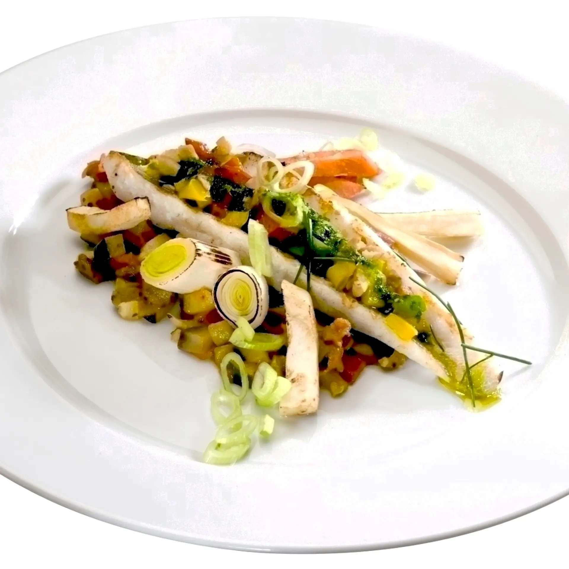 Læs opskrift : Sandart bagt på skaldyrsbund med mild chiliolie og grillet rødløg