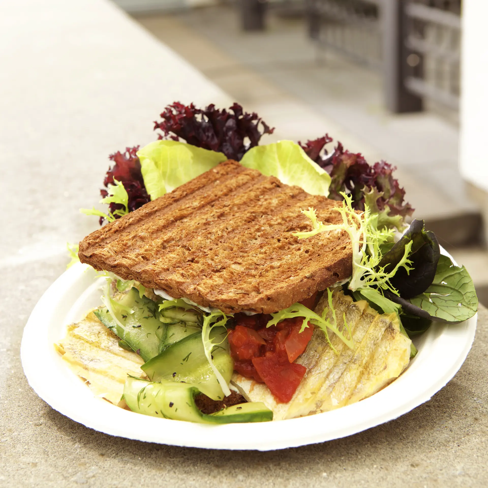 Læs opskrift : Sandwich med grillet sandart, tomatrelish og agurkesalat