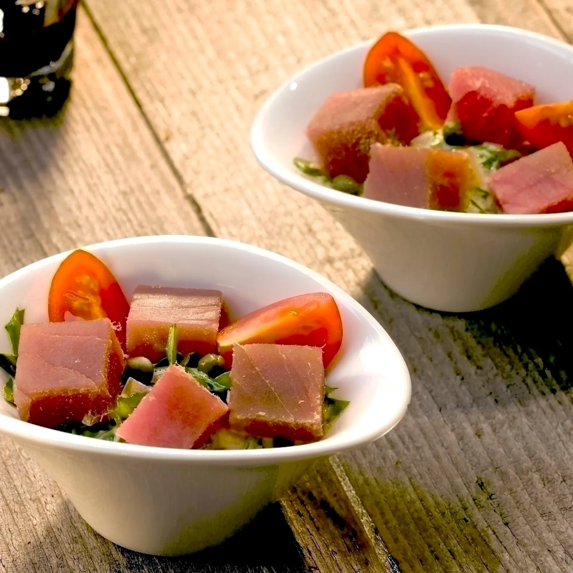 Tern af røget tun på tomat og rucola bundet sammen af kapersaioli