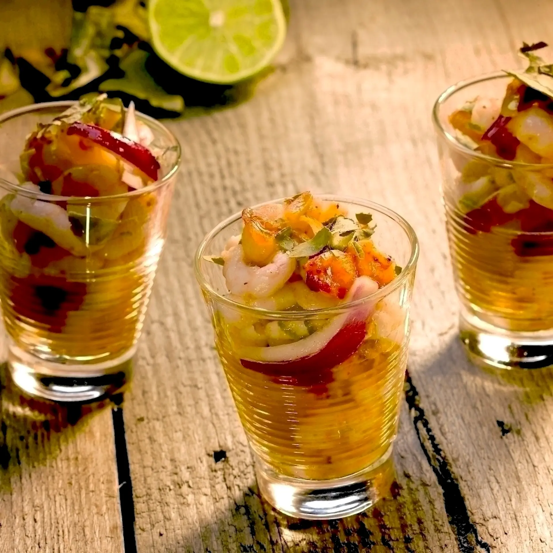 Læs opskrift : Kompot af to slags rejer i syrlig lage med knuste limeblade