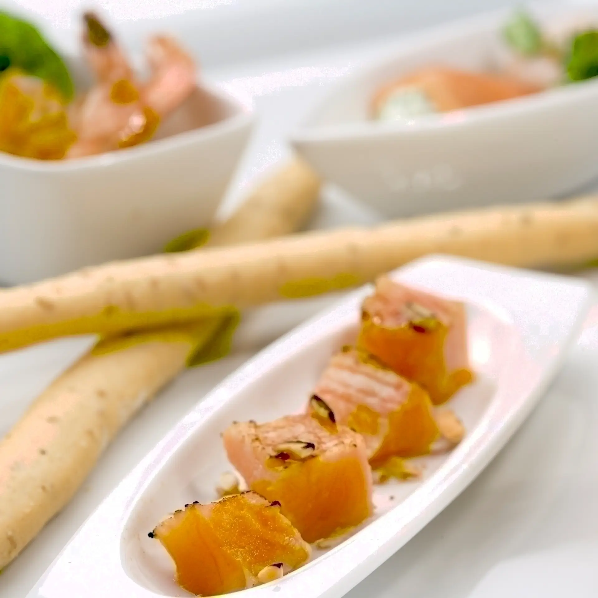 Læs opskrift : Røgede laksetern, gratineret mandel og rørsukker