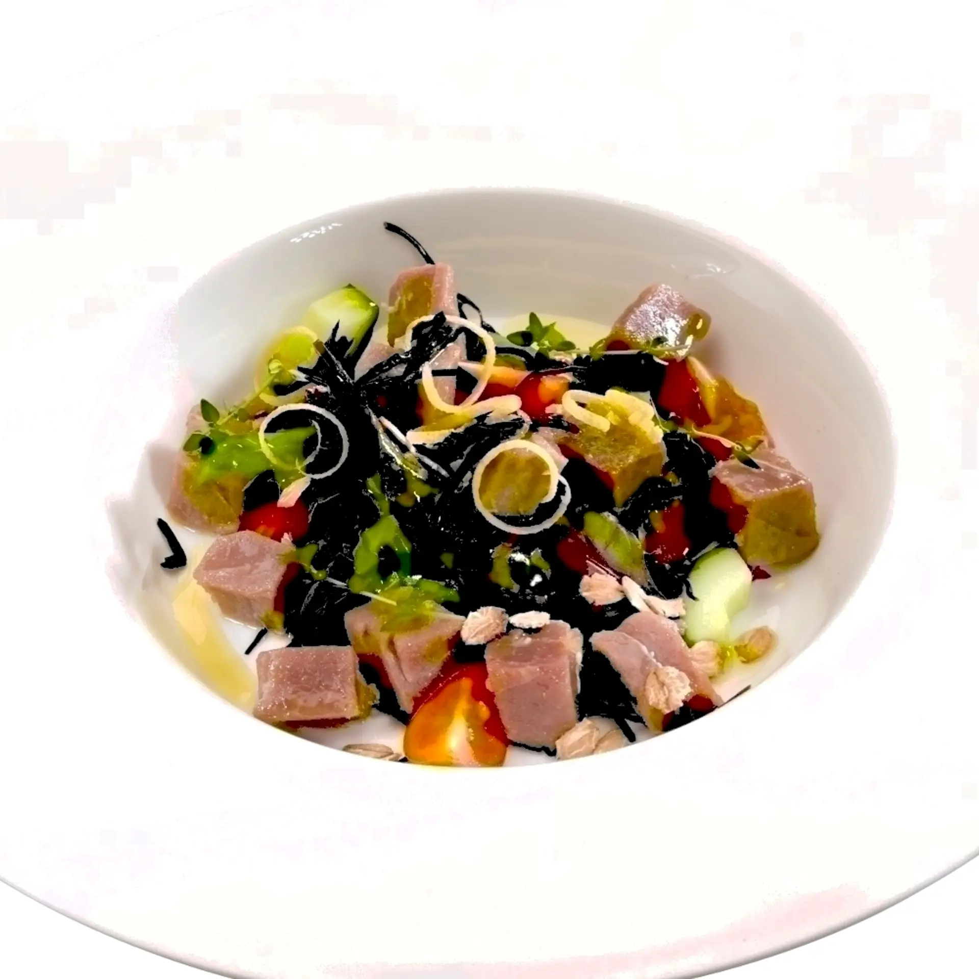 Læs opskrift : Kuber af røget tun med wasabiolie og tangsalat
