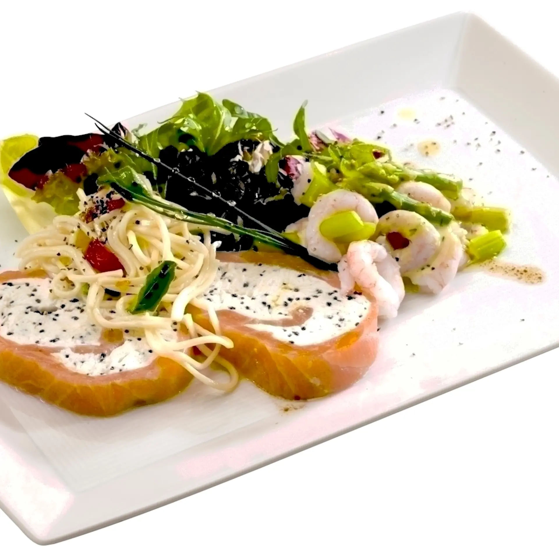 Lakseroulade med flødeost på cremet rejesalat og marinerede vermicelli
