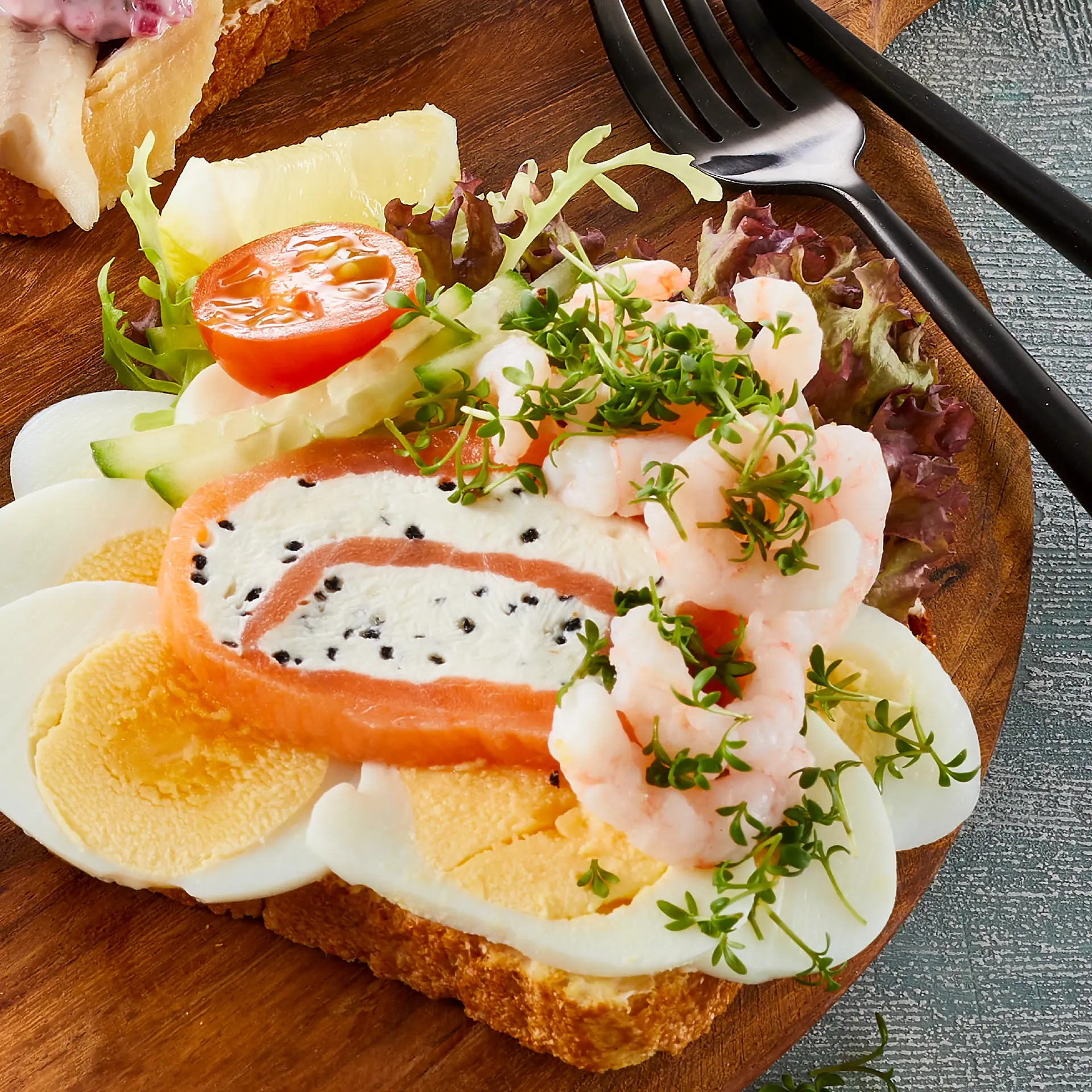 Læs opskrift : Røget laksekornet med flødeost, krydderurter og rejer
