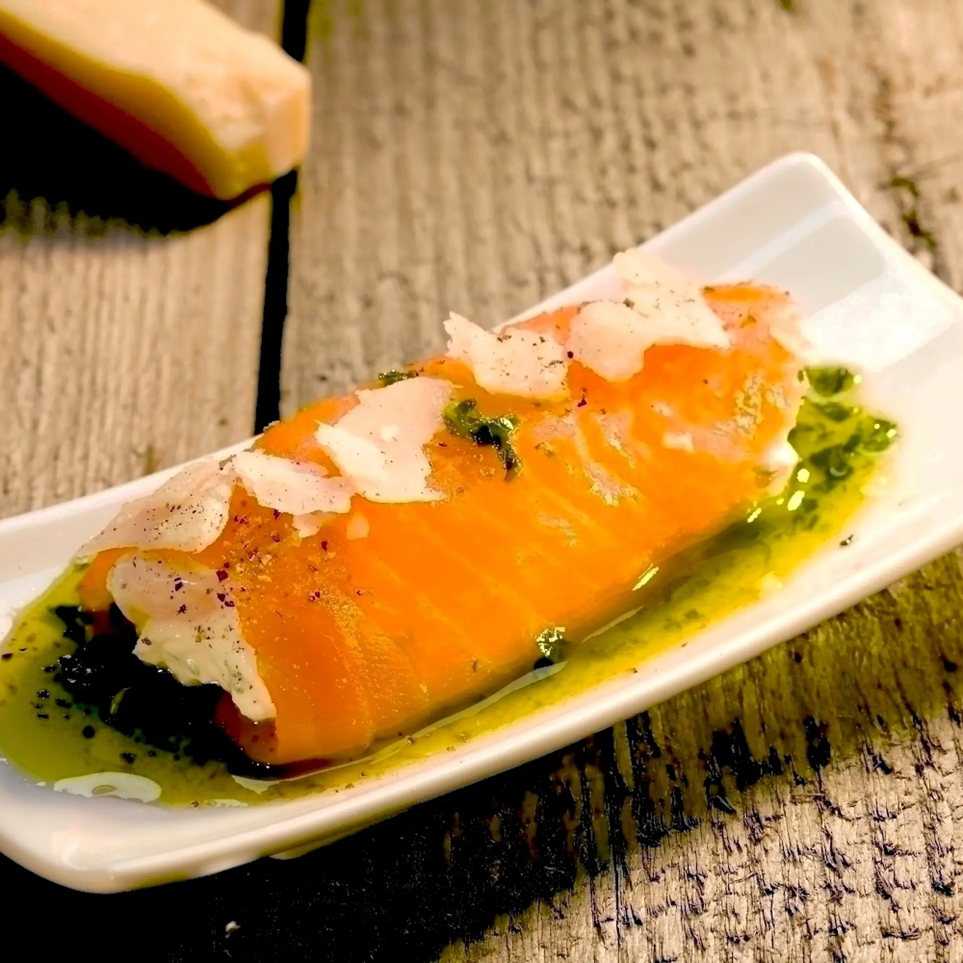 Grove tern af varmrøget laks på pesto af valnødder, rucola og appelsinsaft