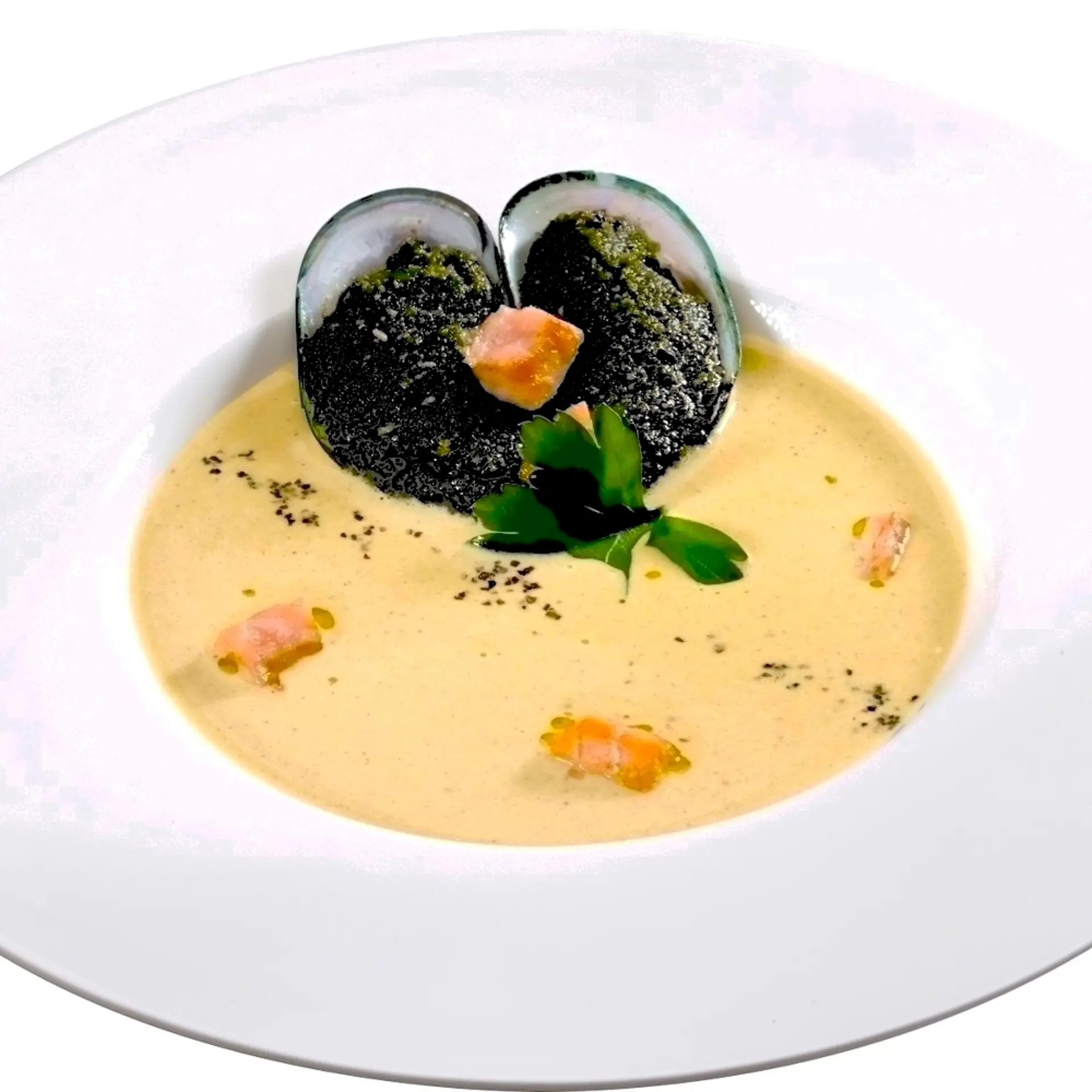 Suppe af grønne muslinger med røget laks og rucolapesto