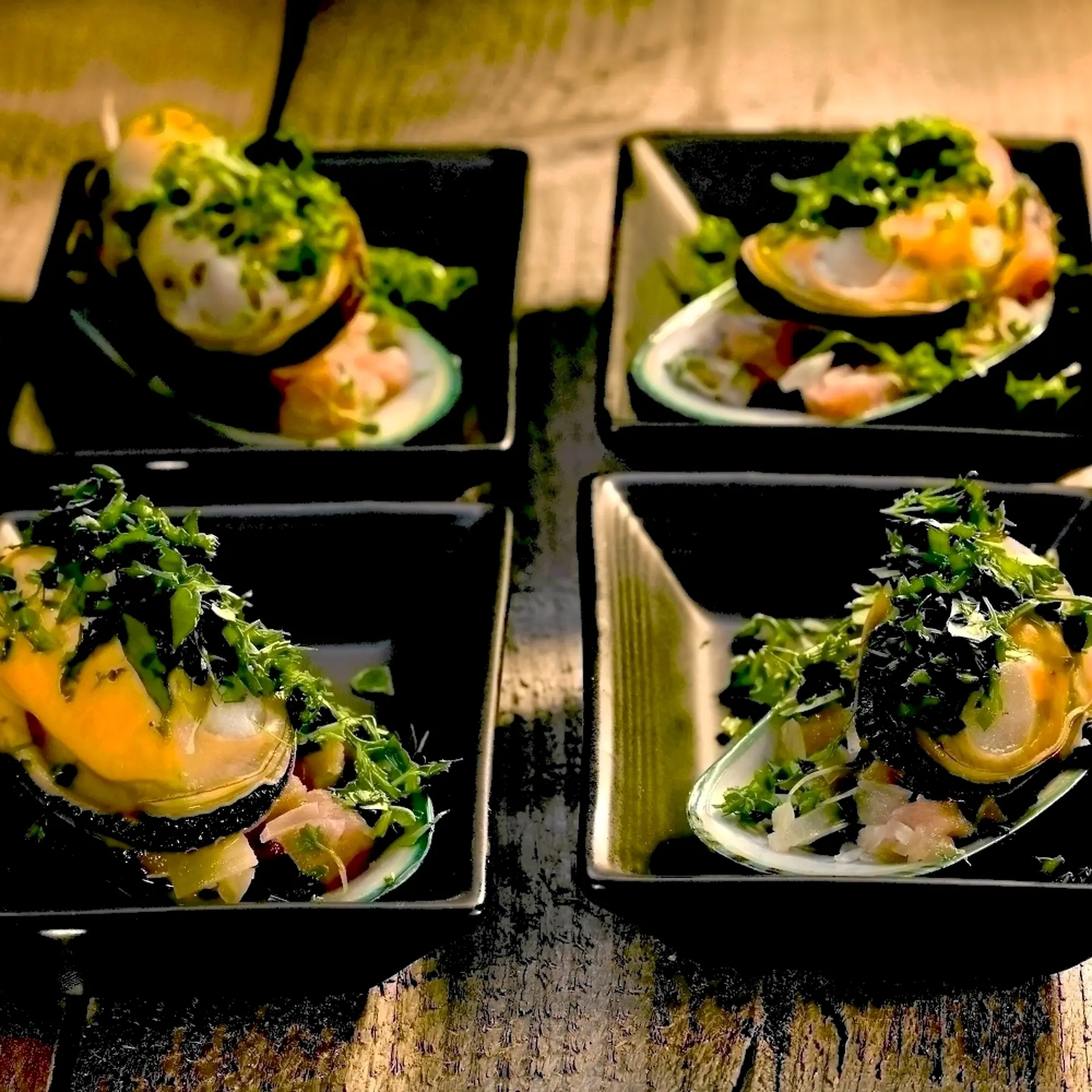 Læs opskrift : Suppe af grønne muslinger med røget laks og rucolapesto