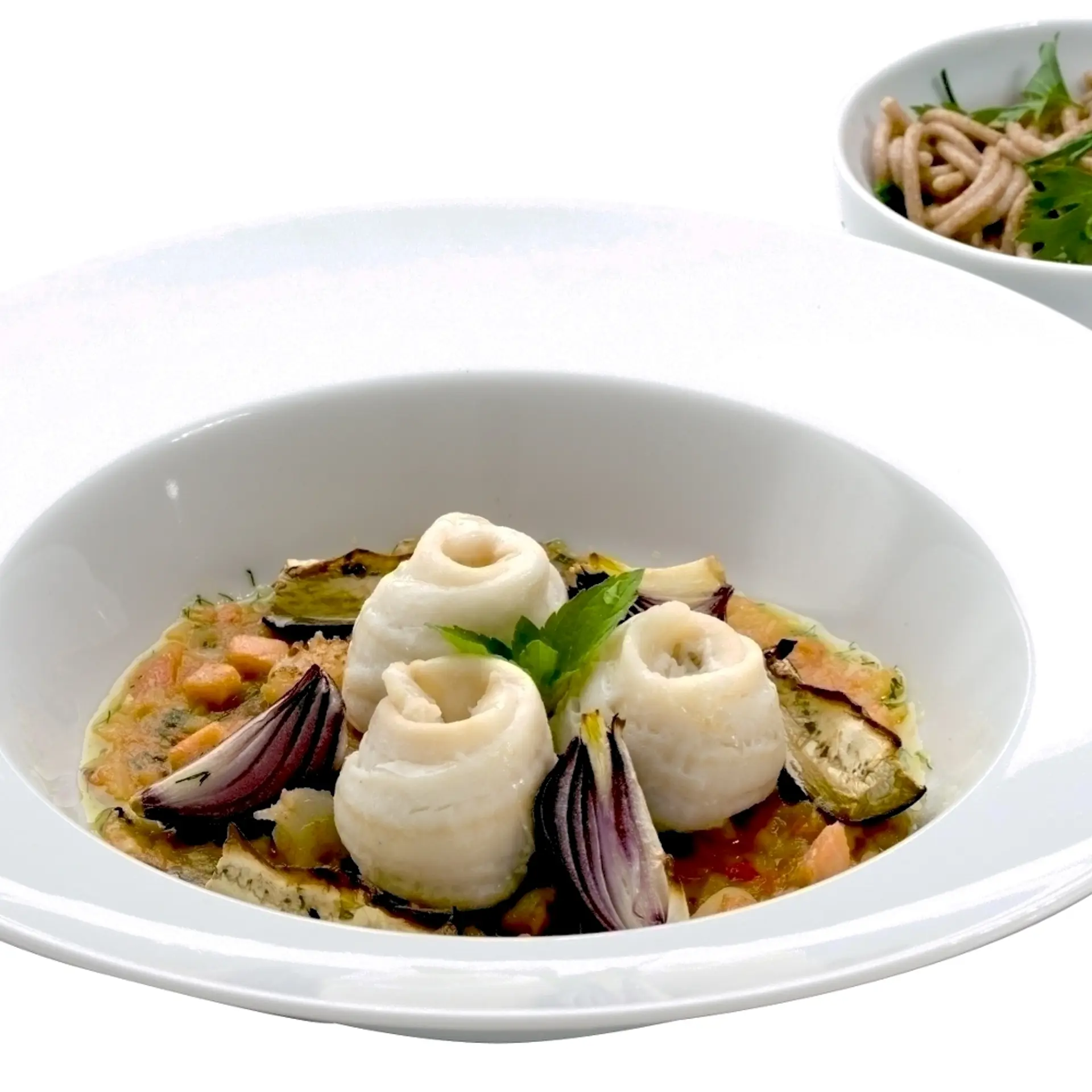 Læs opskrift : Rulle af hvidløgspandekage og hellefisk med tomatostecreme på rejesalat