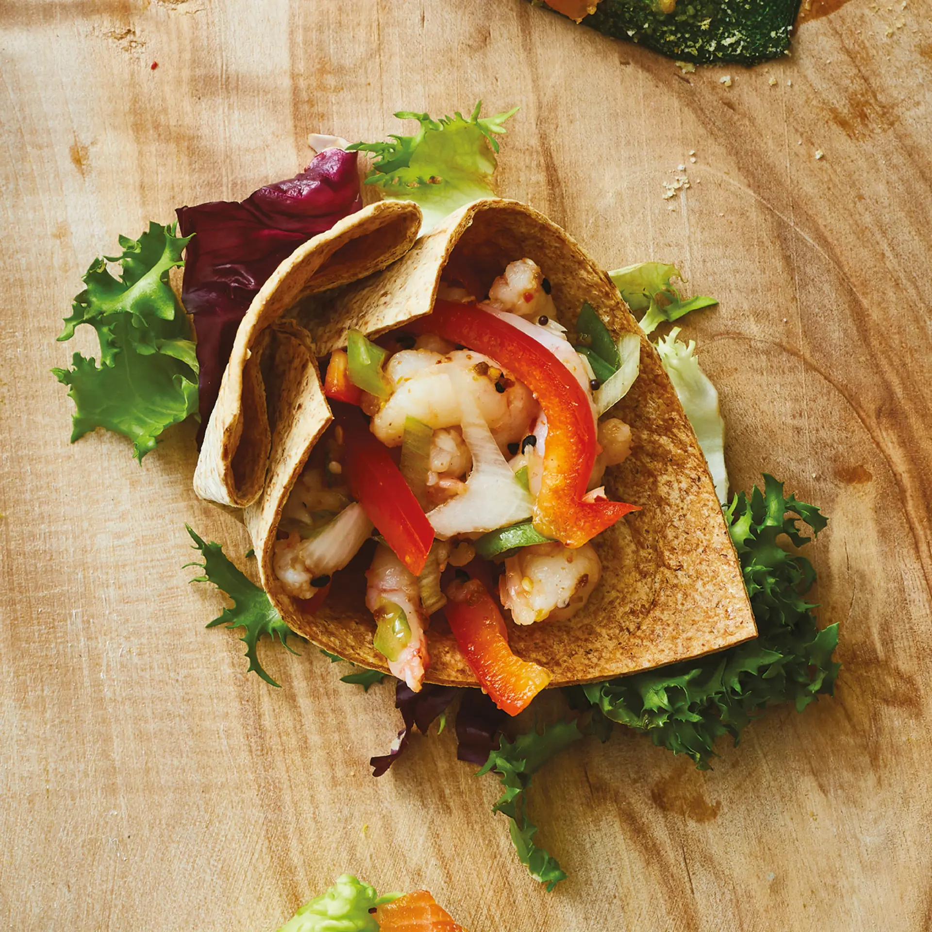 Indbagt sej på tortilla med stegt majs, BBQ, guacamole og rejespyd
