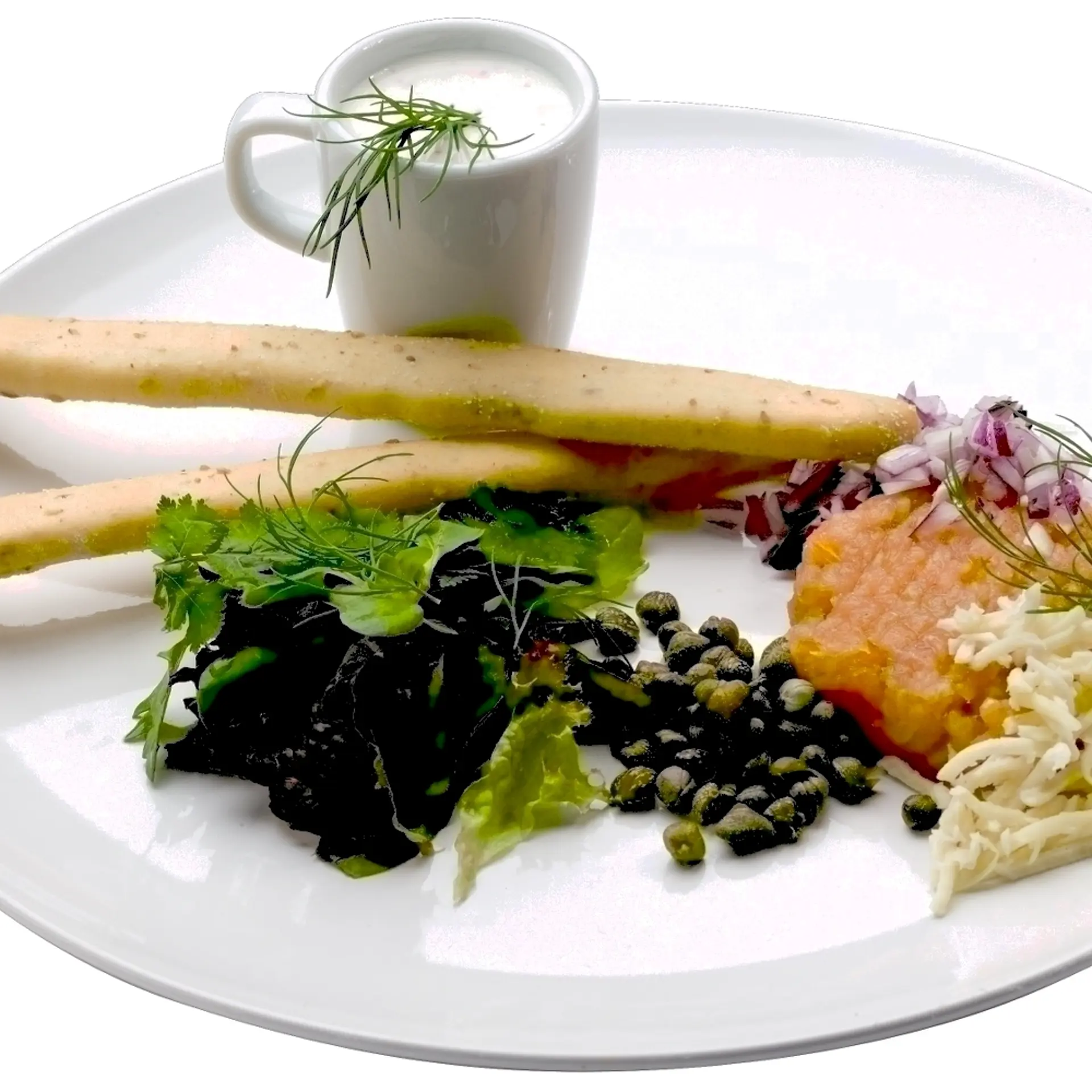 Fyldt røget lakseskive med stenbiderrogn, friske krydderurter og græsk yoghurt