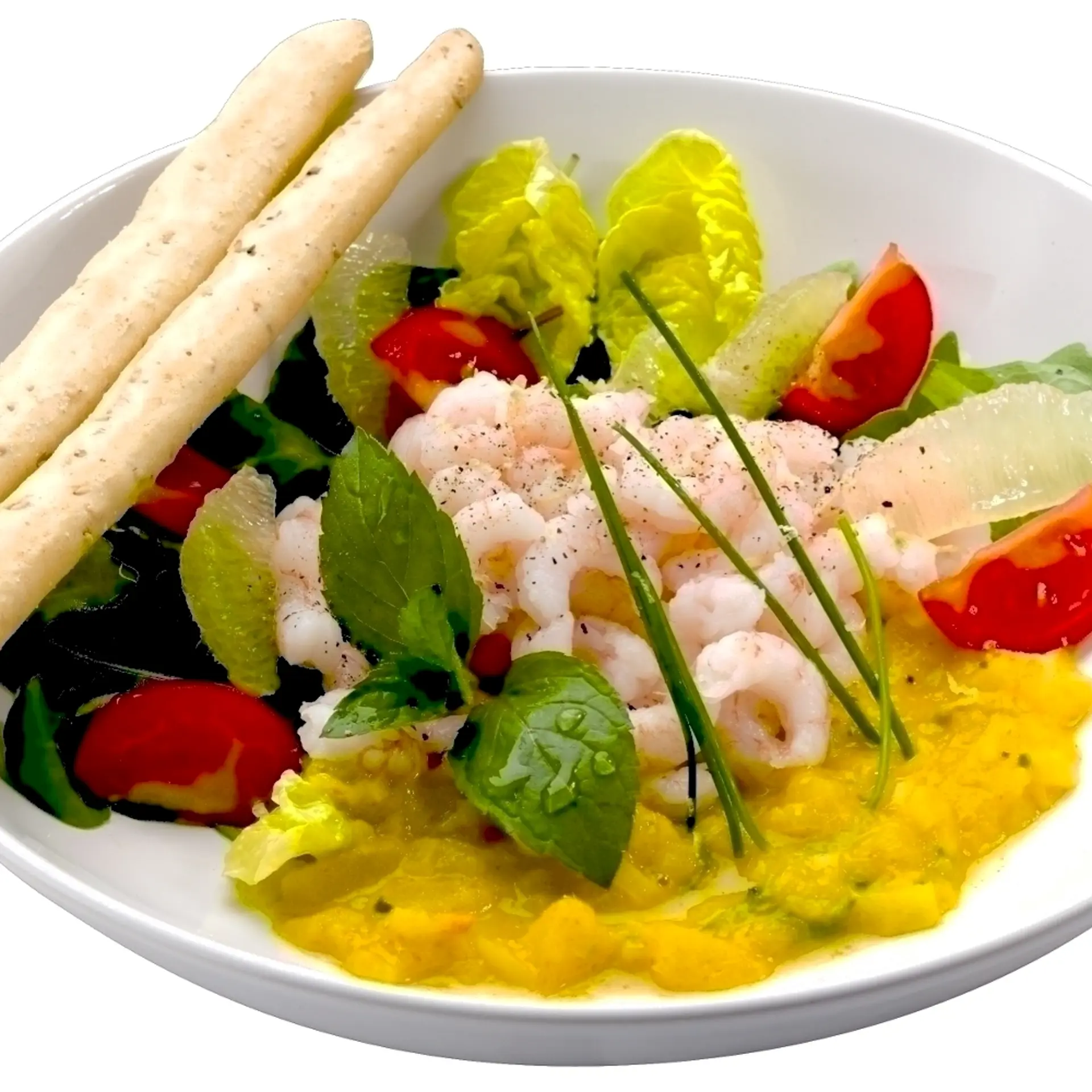 Håndpillede rejer på trio af squash, fennikel og æbler med urtedip