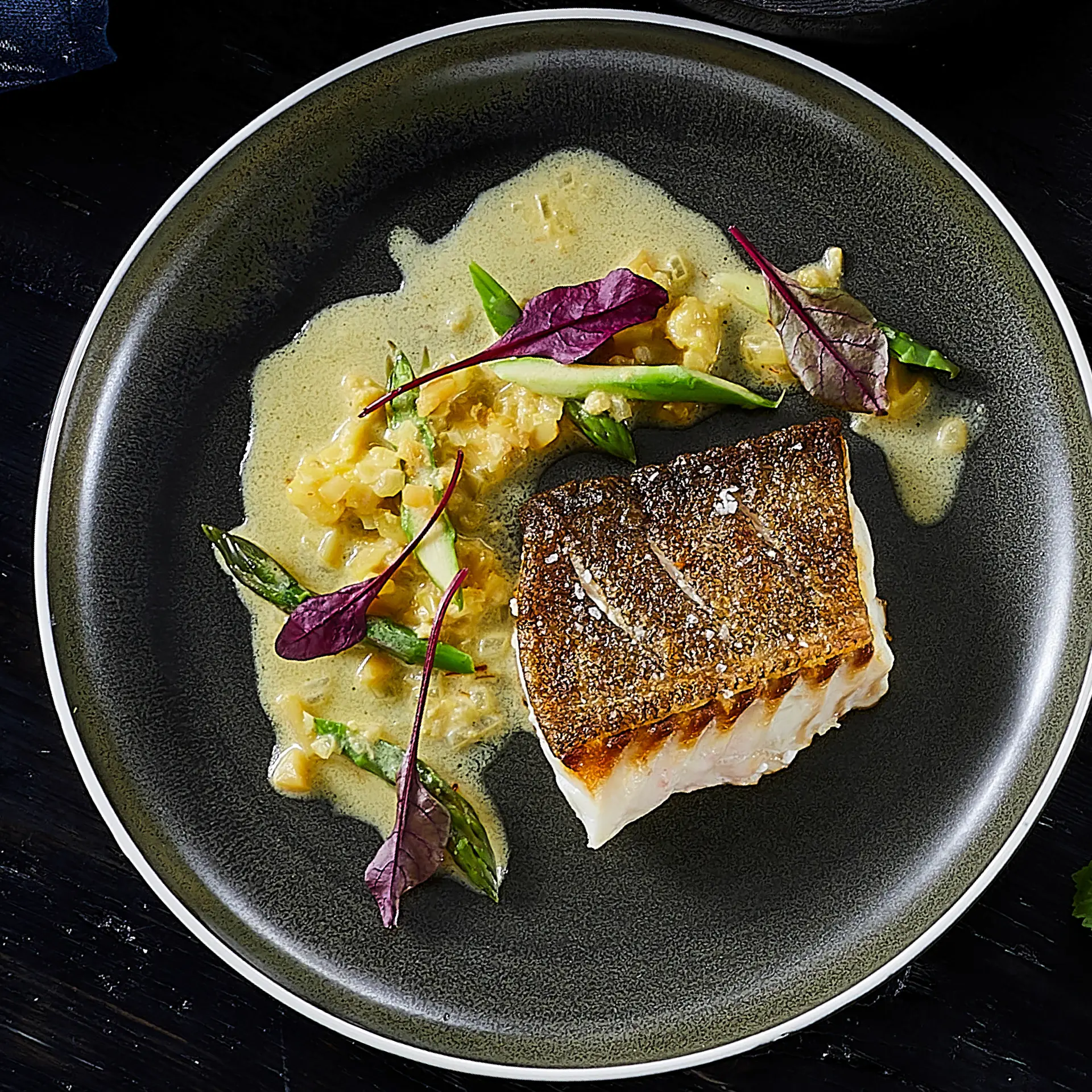 Skindstegt torsk på ragout af kammusling og grønne asparges