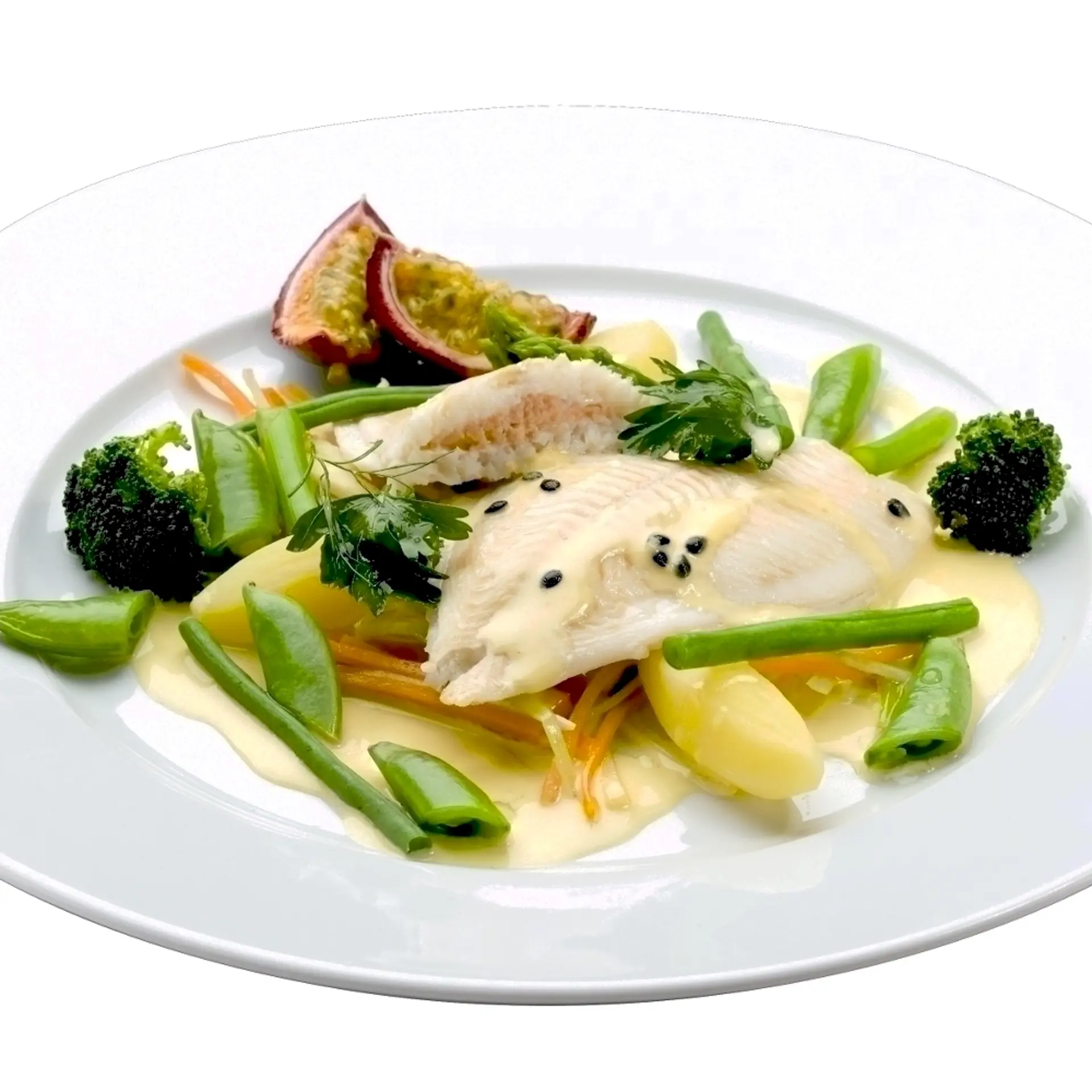 Isingfilet med laks på passionsfrugtcreme med grønne grønsager