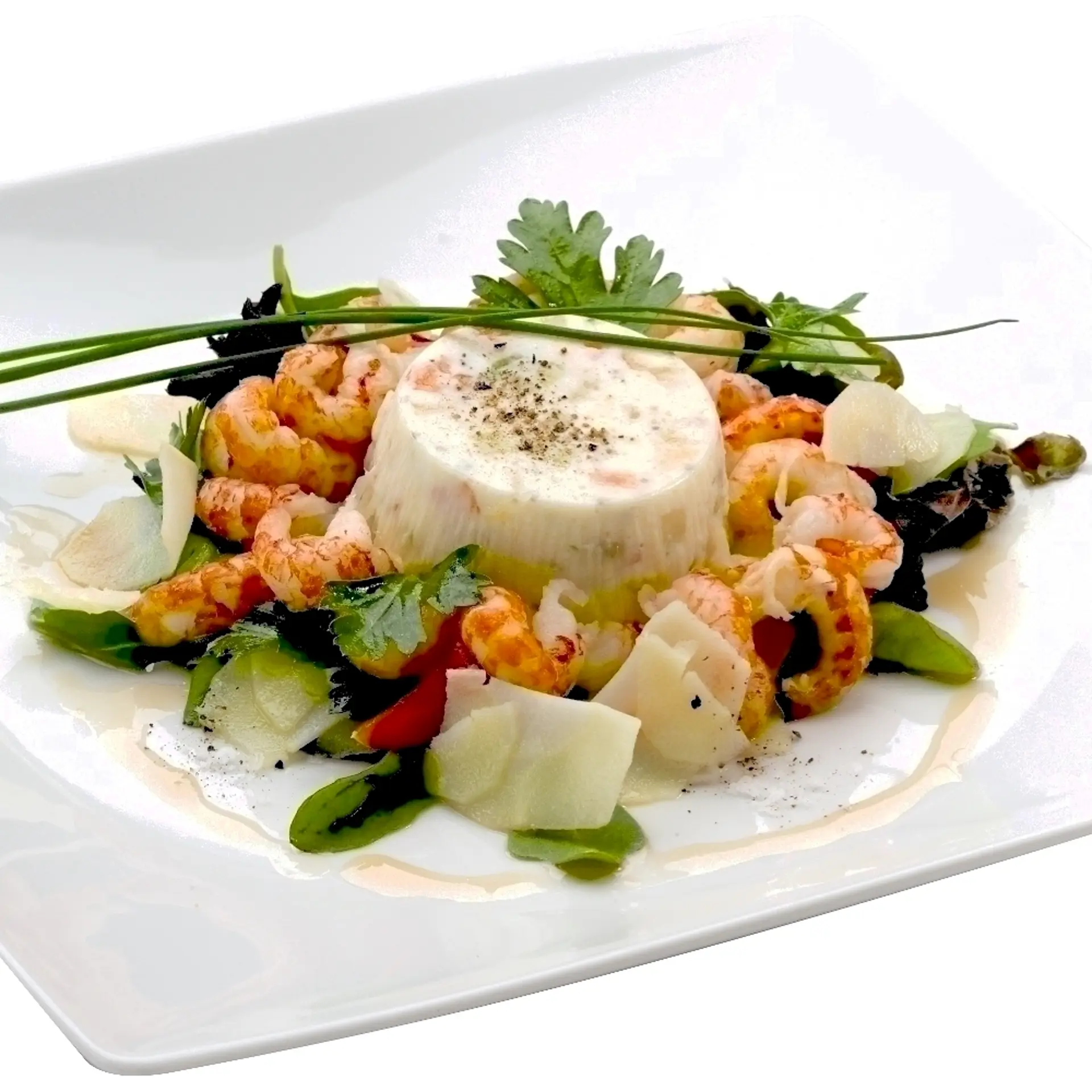 Lakseroulade med flødeost på cremet rejesalat og marinerede vermicelli