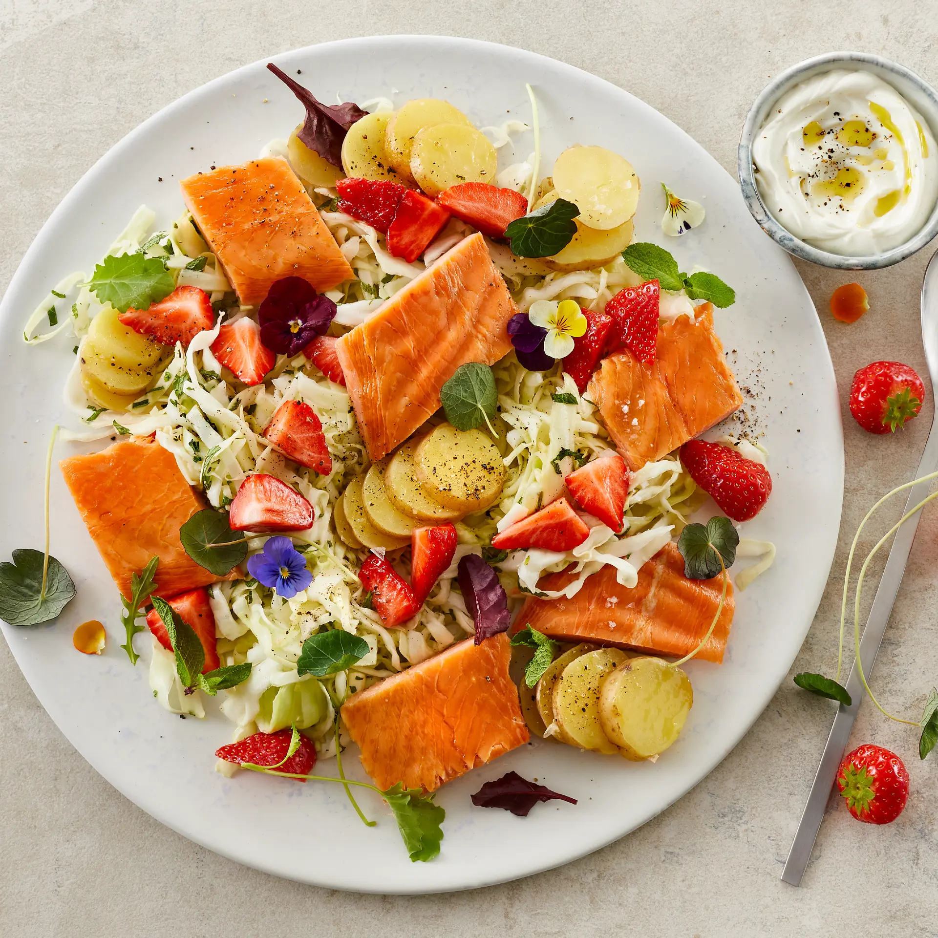 Varmrøget laks med salat af rimmet sommerkål, små nye kartofler og jordbær