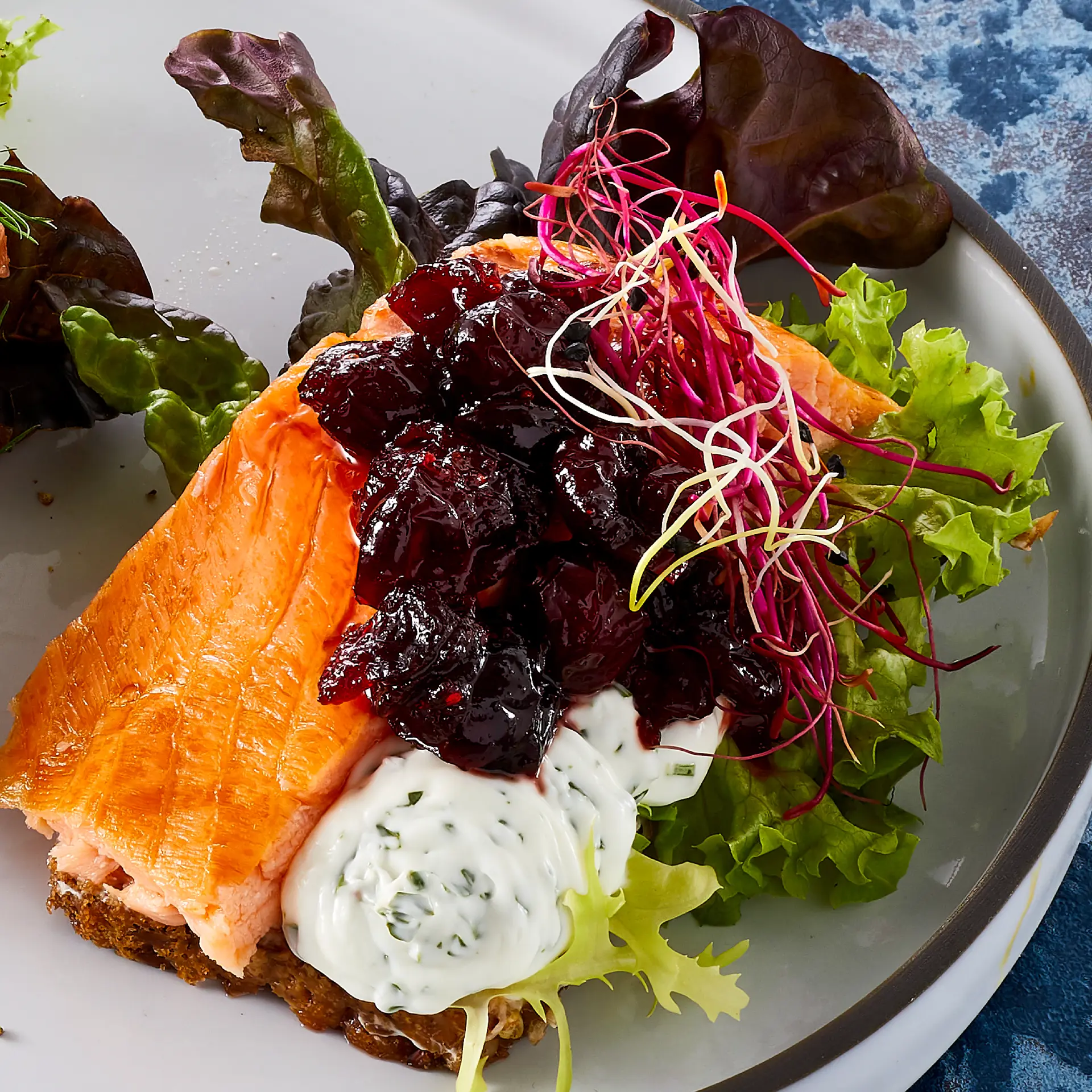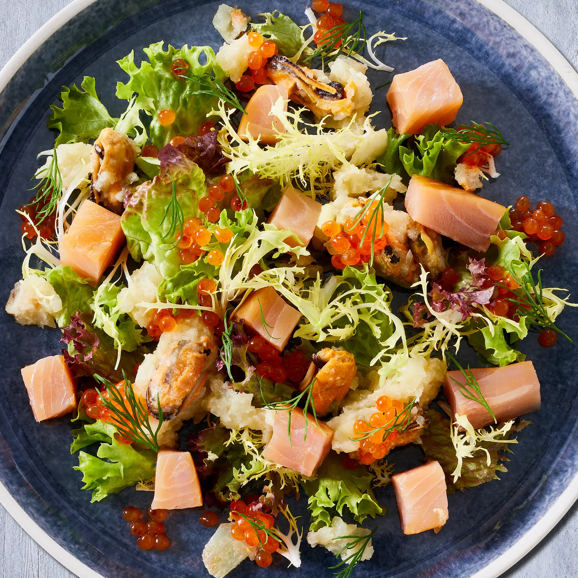 Grove tern af koldrøget østersølaks på salat af blåmusling og fennikel bundet sammen af møre løg