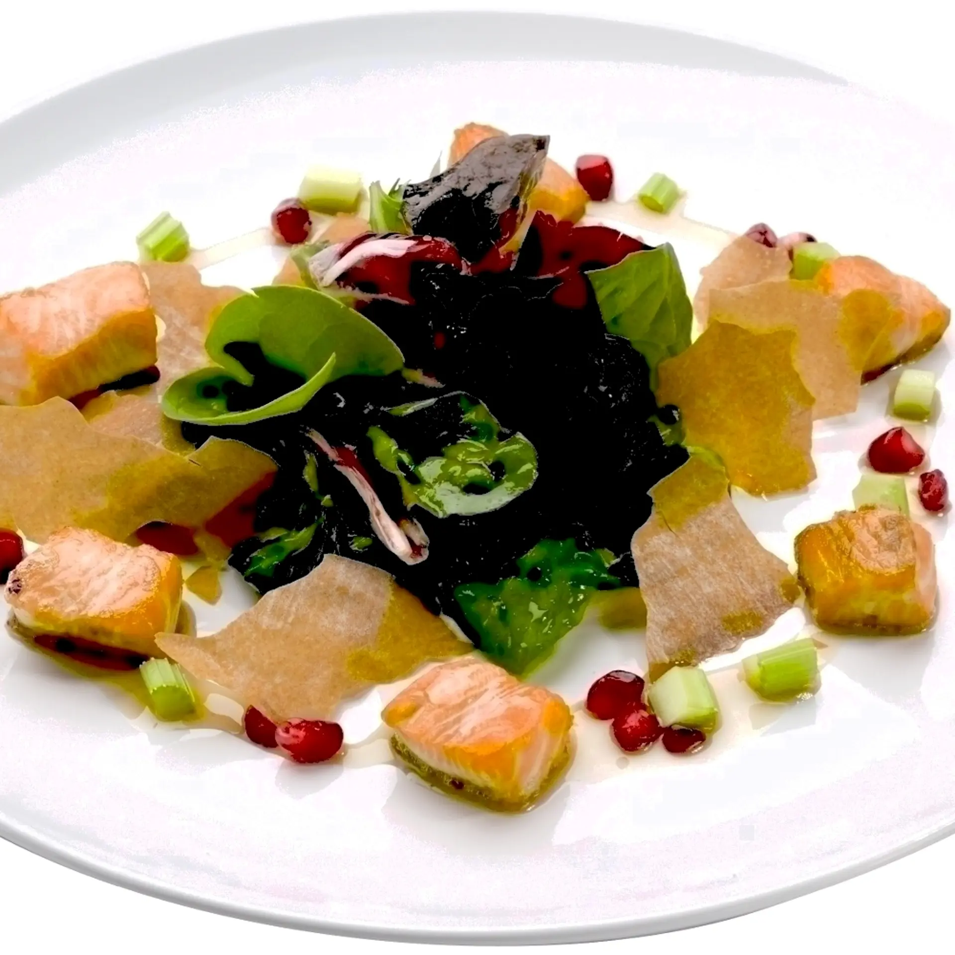Laksesalat med granatæbler, selleri, kommendip og sprød knust dej