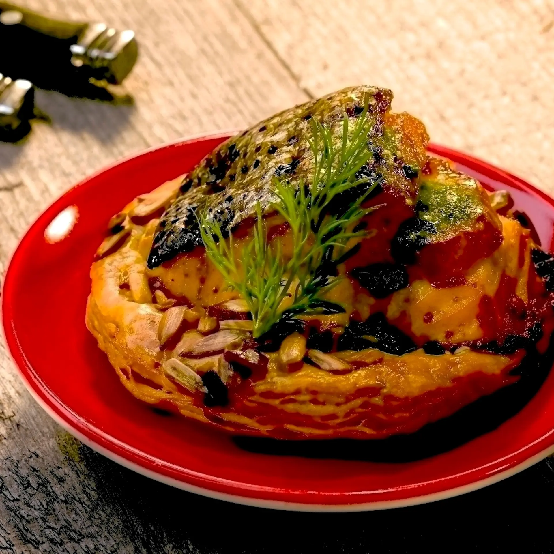 Læs opskrift : Kammusling bagt i lakselomme på butterdej vendt i solsikkekerner
