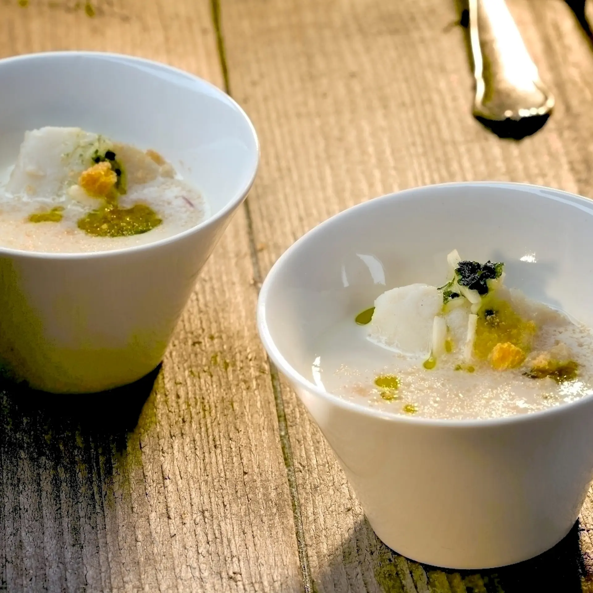 Cremet hvidløgssuppe med hvid fisk, grøn olie og knust brød