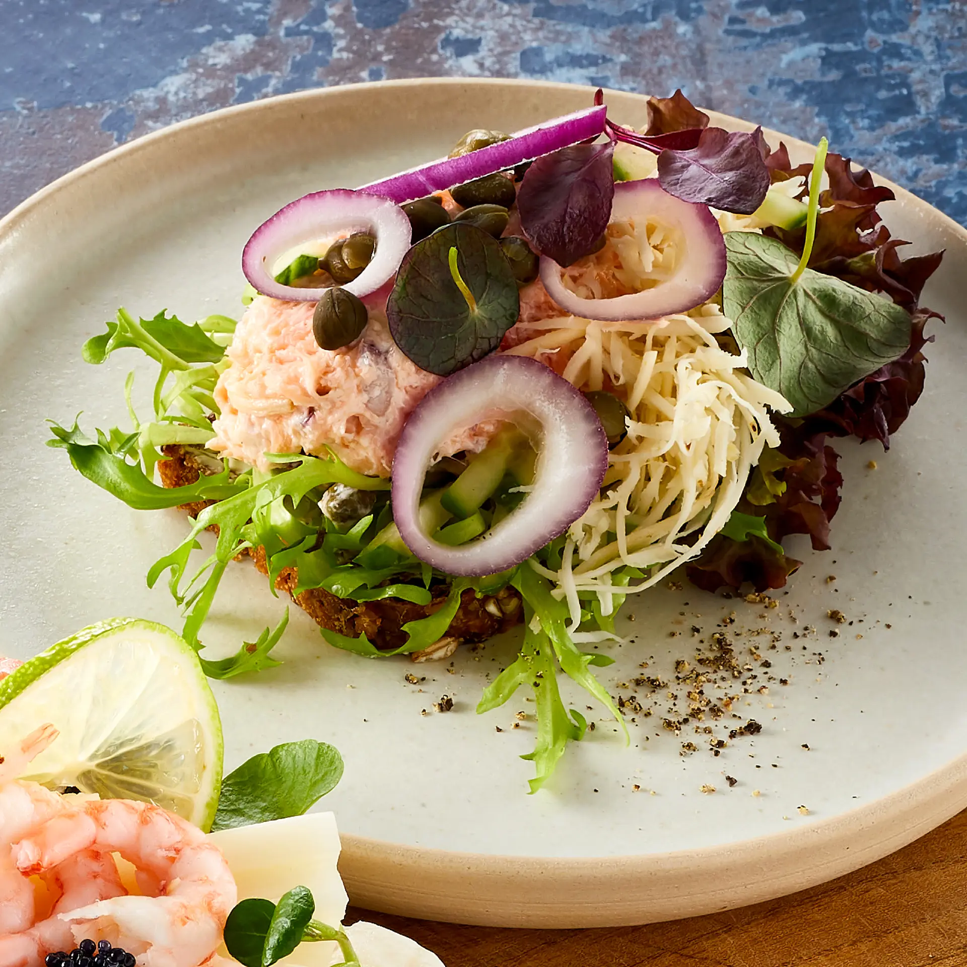 Varmrøget laksesalat med kapers, peberrod og løg