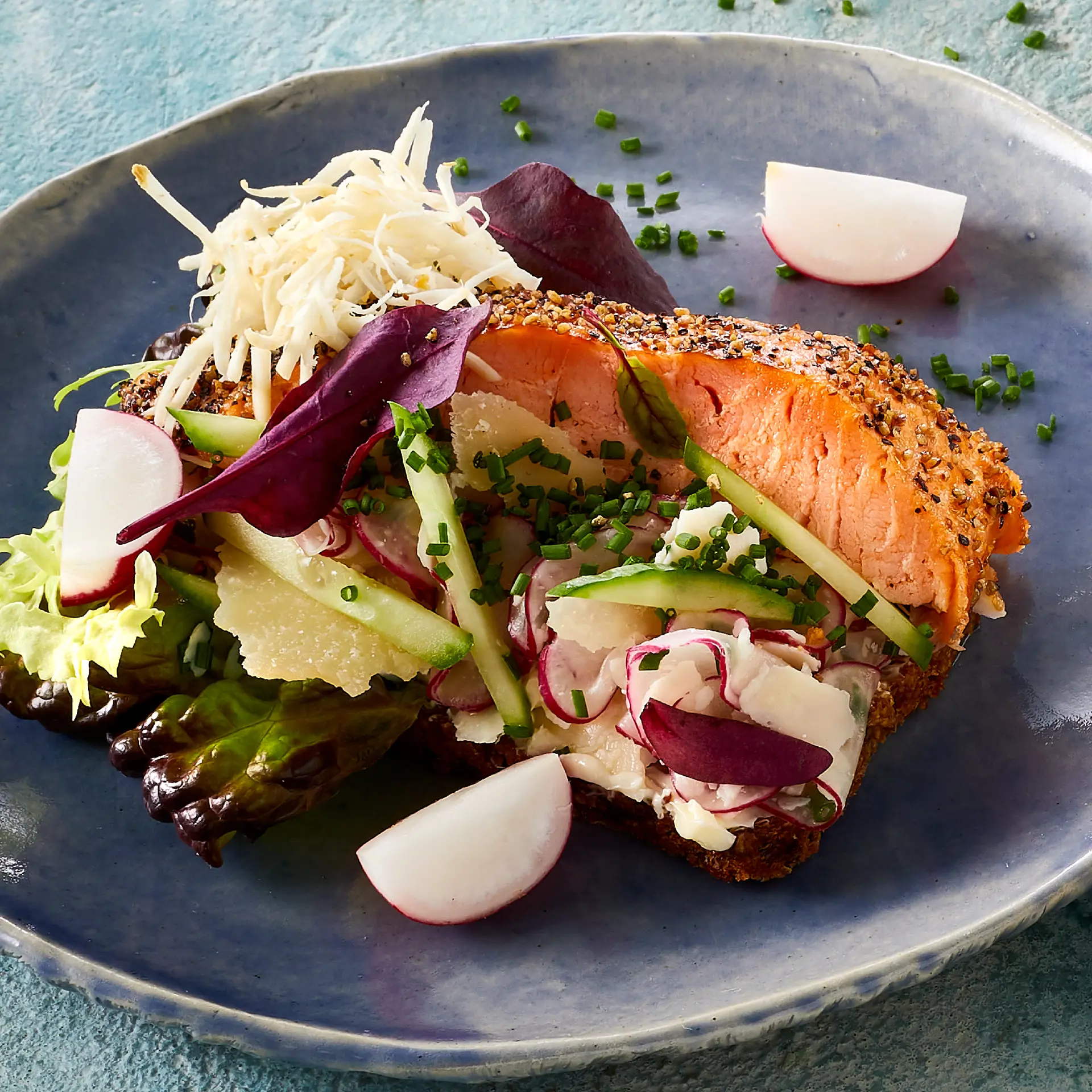 Varmrøget laks i brud på salat af grana padano, purløg og radiser