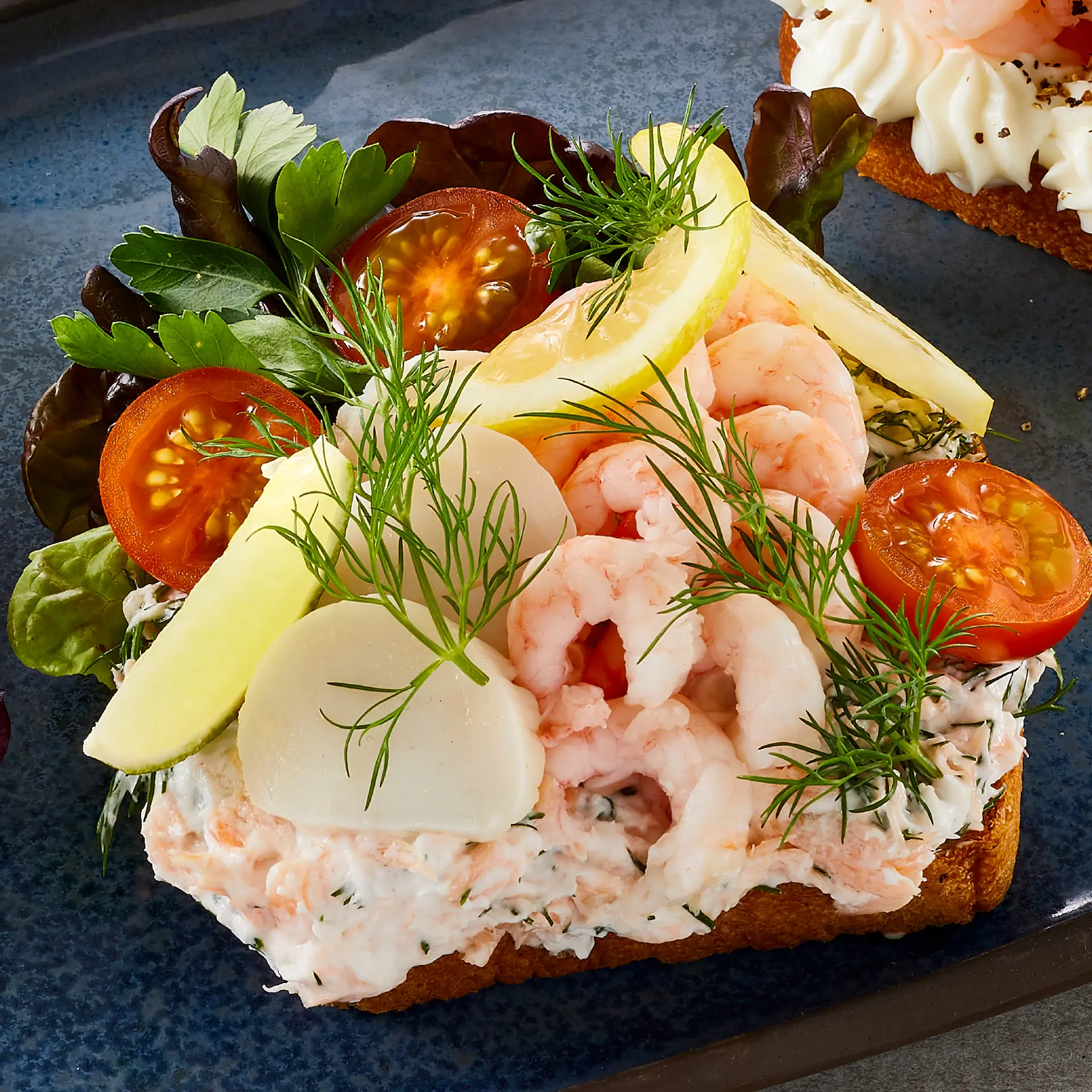 Kammusling og håndpillede rejer på laksesalat