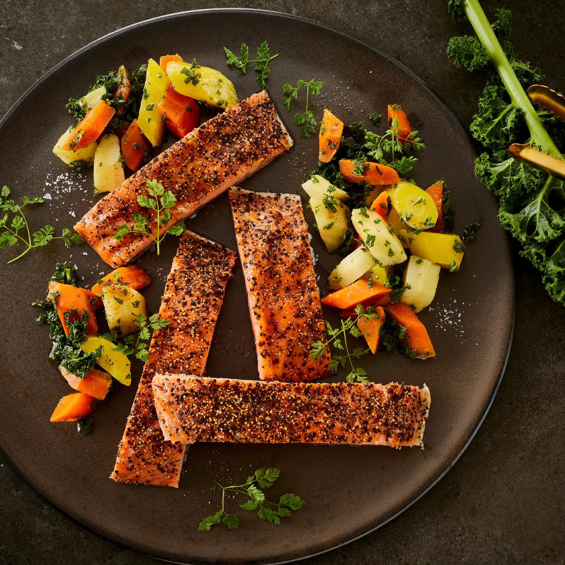 Blokke af varmrøget laks med kold sammenkomst af danske vintergrønsager bundet sammen af grønkålolie