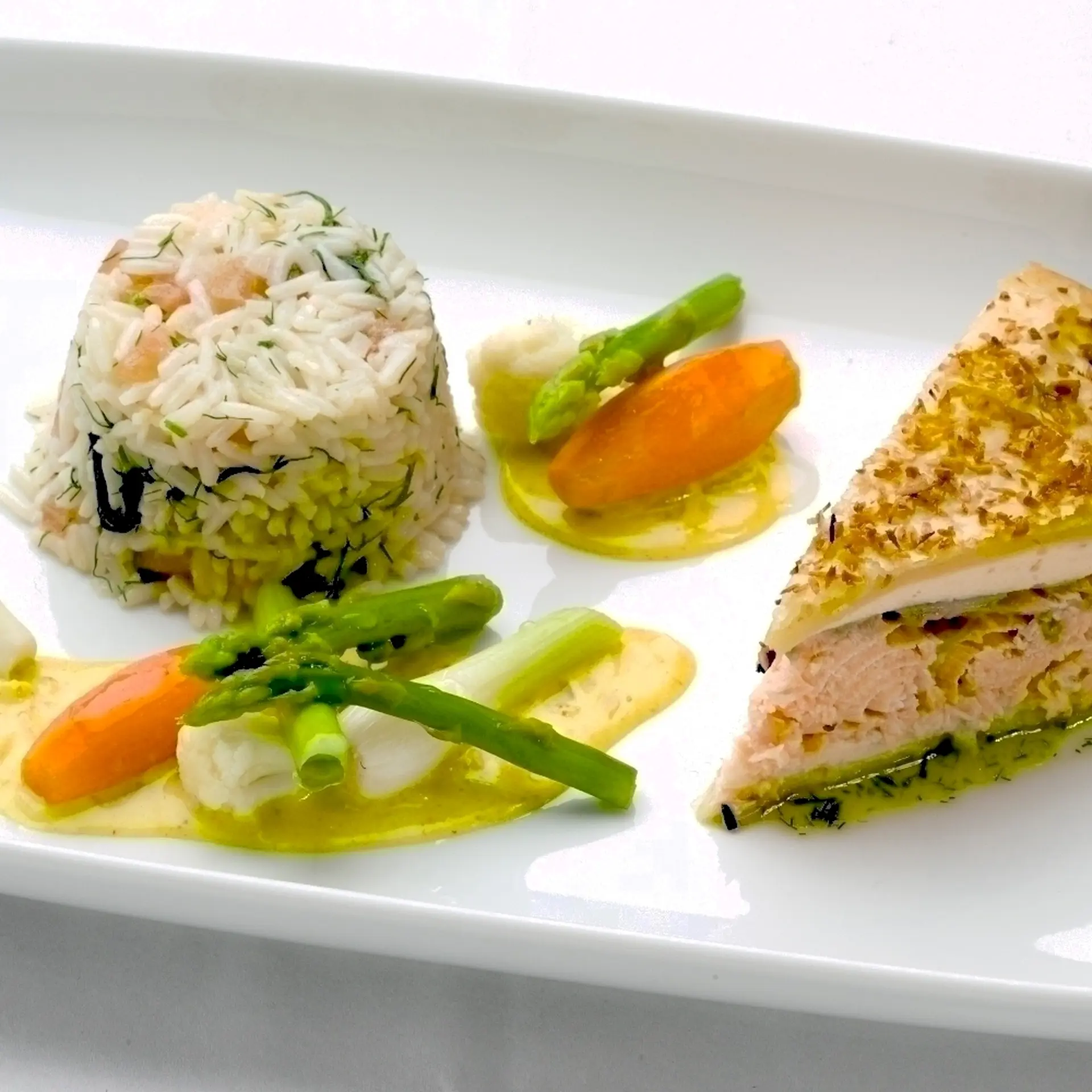 Indbagt laksefilet i kokos-butterdej med karrycreme og ristimbale