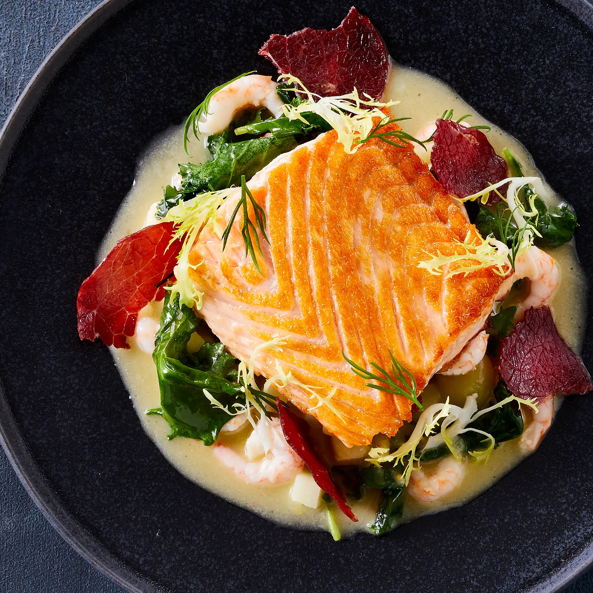 Hårdt stegt laks med fragmenter af sprød bresaola, ragout af æbler, spæde grønkål og rejer i skilt stikkelsbærsmør