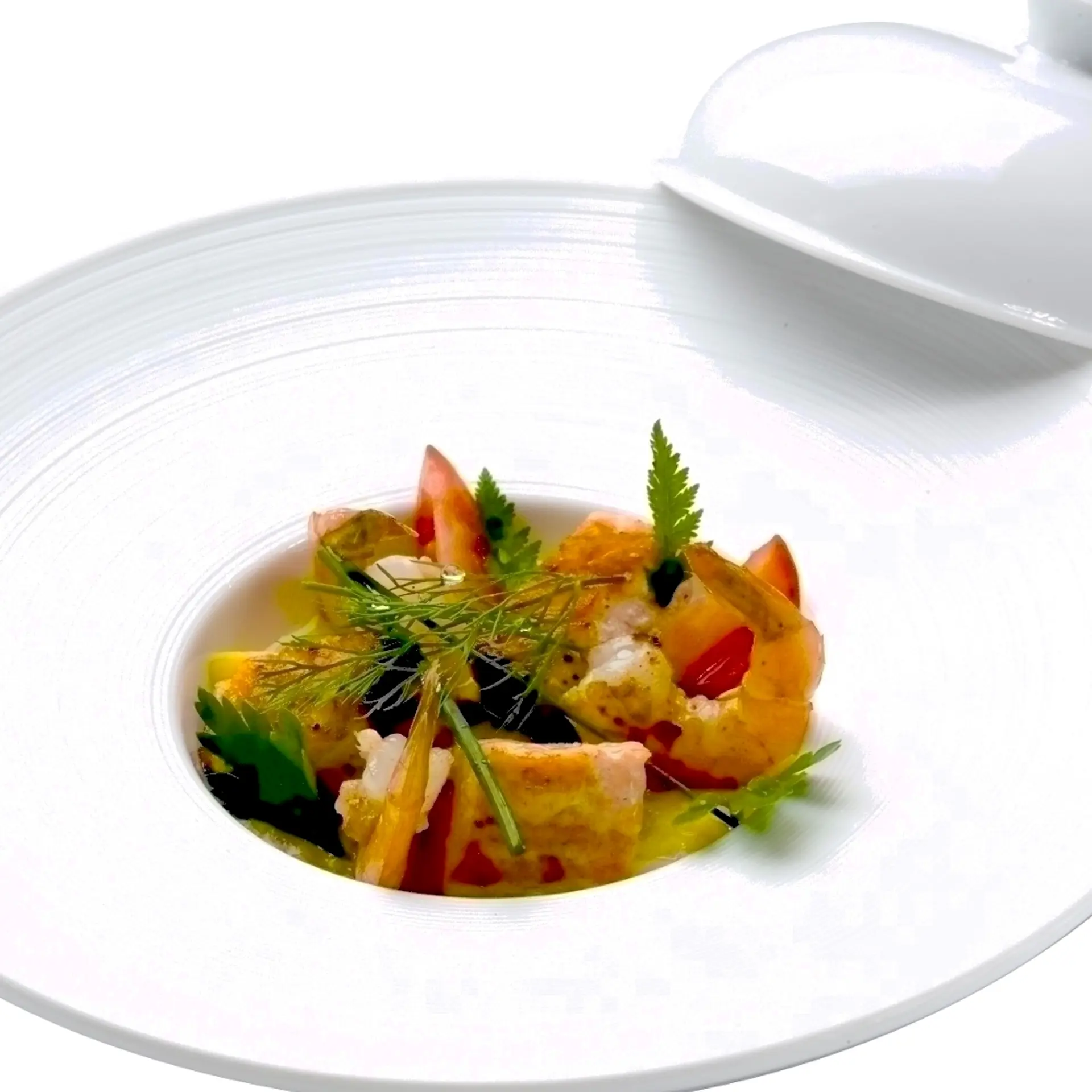 Stegt rødspætte og dampet laks med håndpillede rejer, grønne asparges, tomatmayonnaise og strimler af røget laks