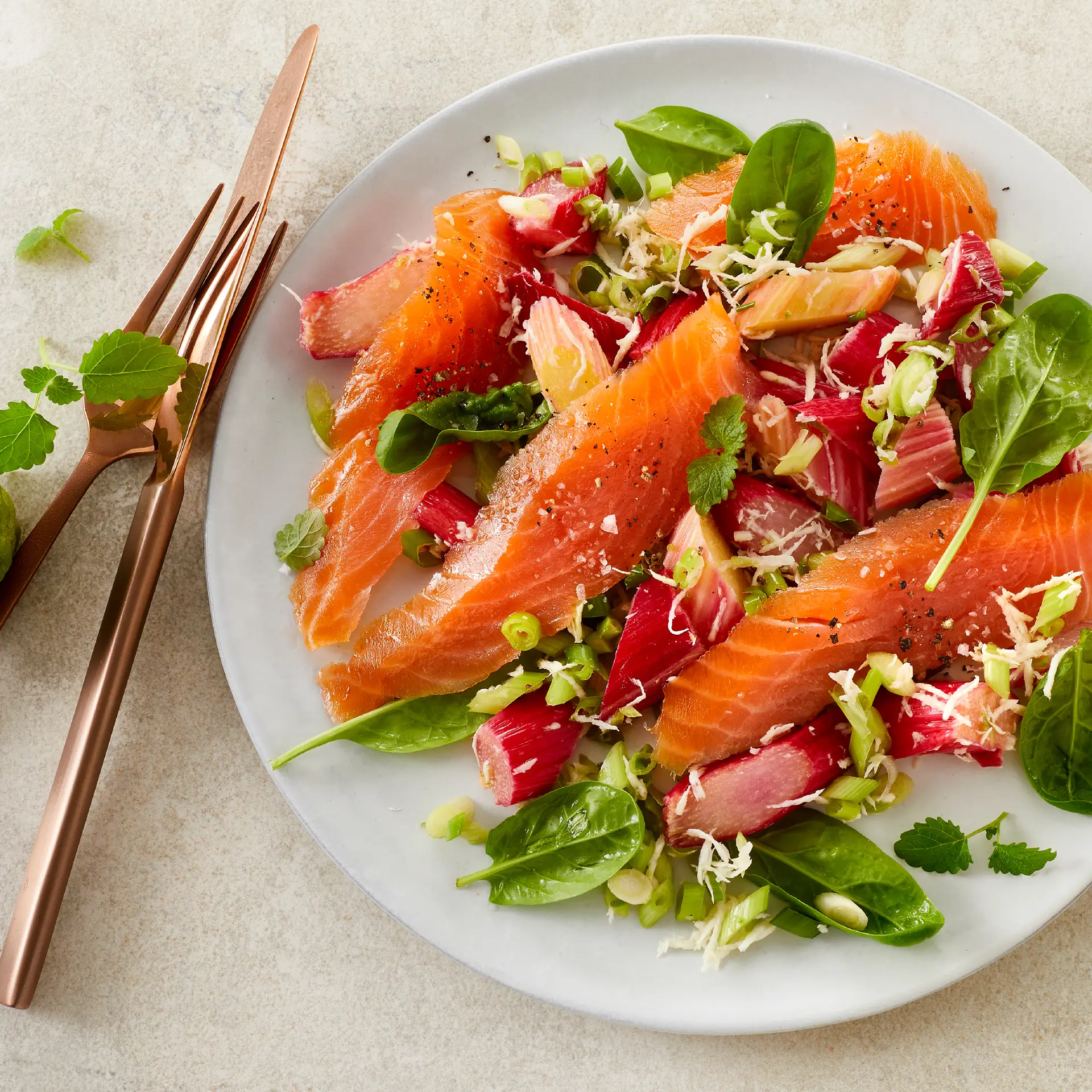 Løs laksetatar med syrlig kompot af vinrabarber, peberrod, forårsløg og spædspinat