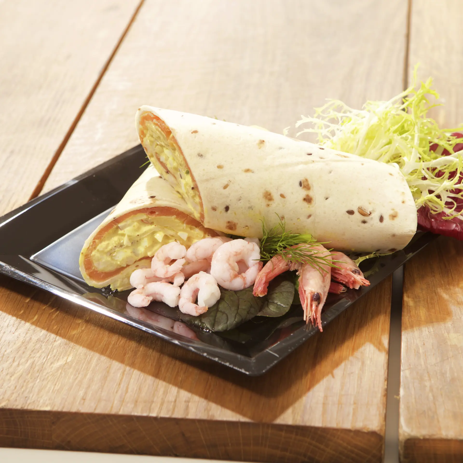 Wraps fyldt med røget laks og æggesalat