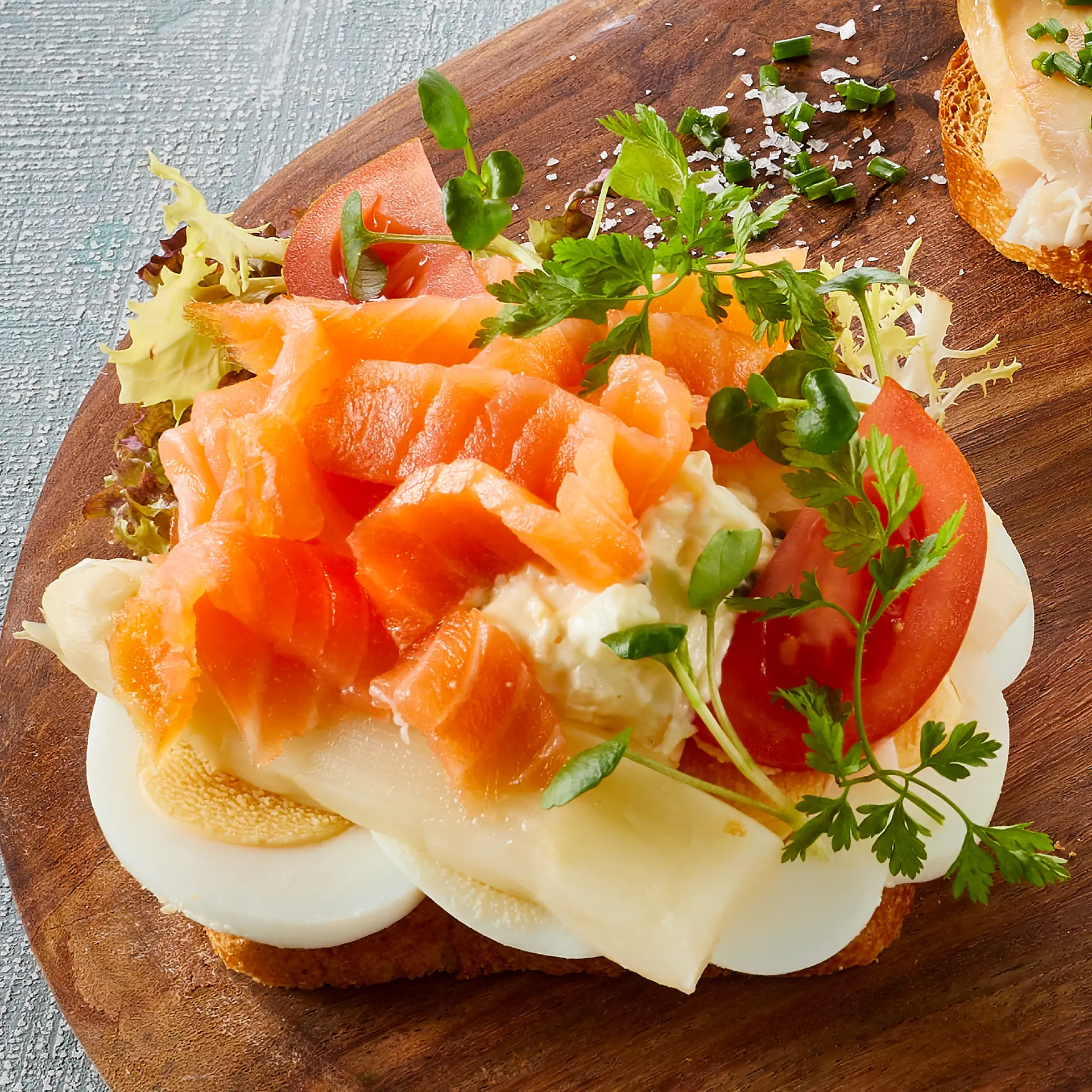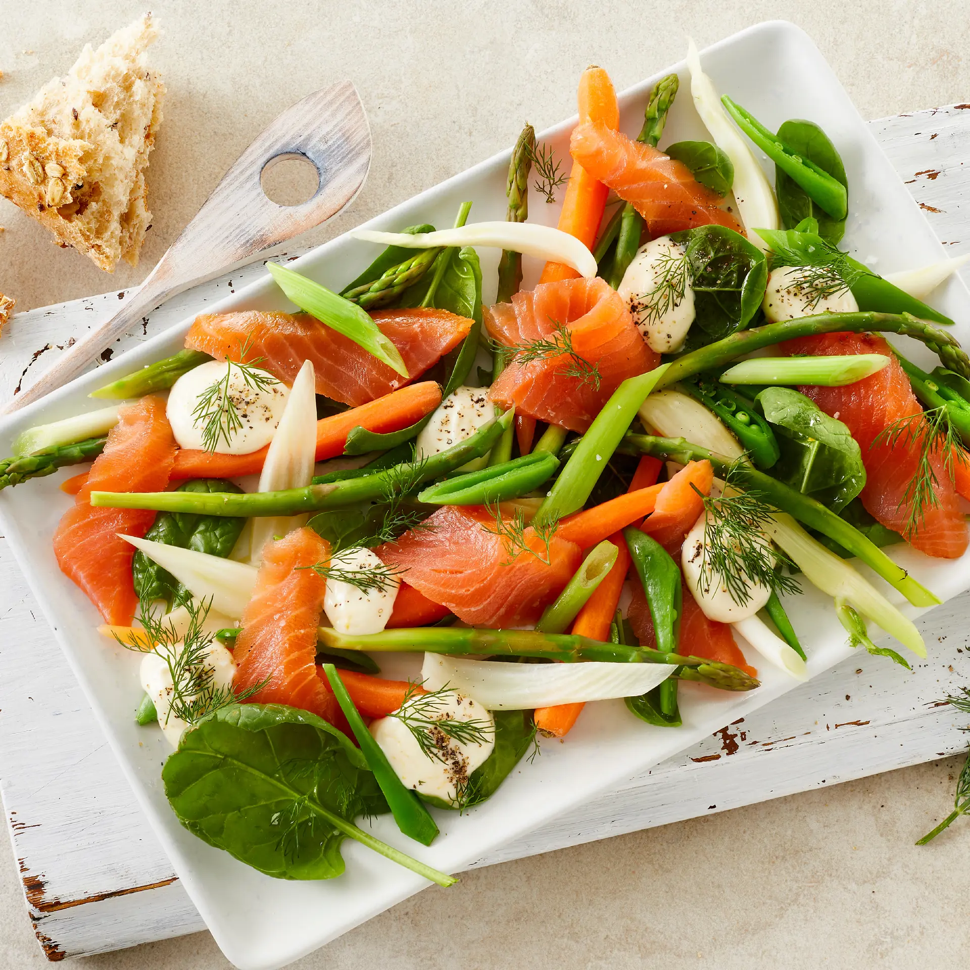 Læs opskrift : Koldrøget laks i strimler på kogt æg, æggesalat og slikasparges