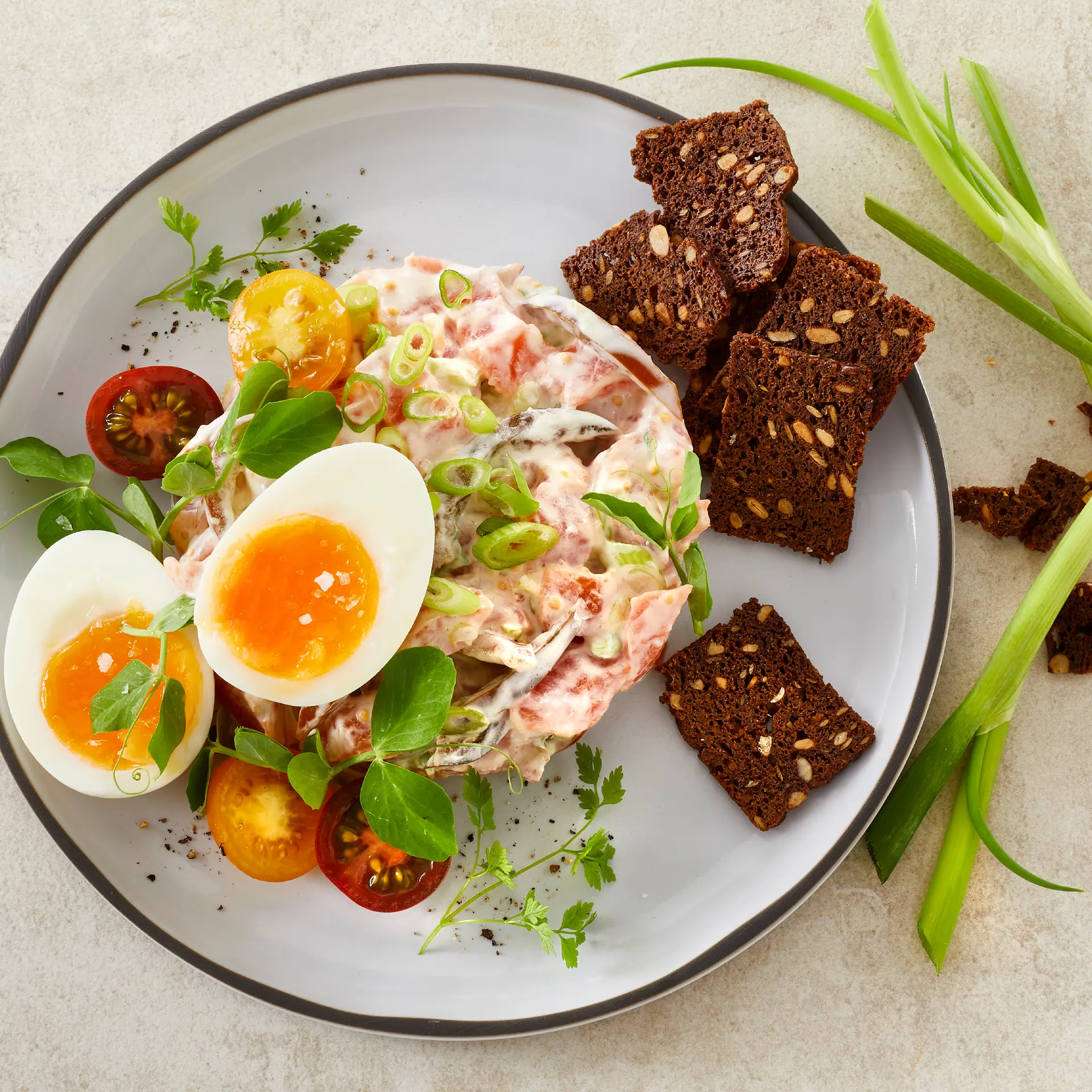 Smilende æg på kold ragout af røget laks, sennep, nye salatløg og grønne tomater
