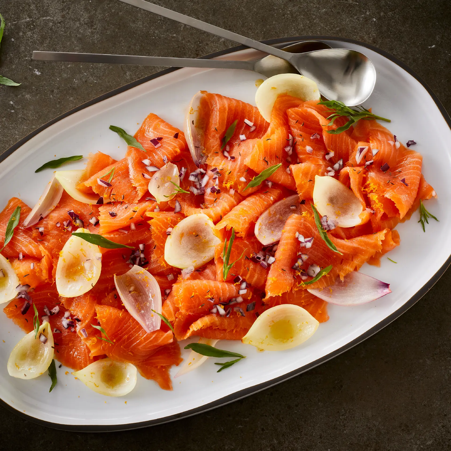 Læs opskrift : Tykke skiver af koldrøget laks i kombination med udvalg af løg syltet med appelsin, honning og kommen