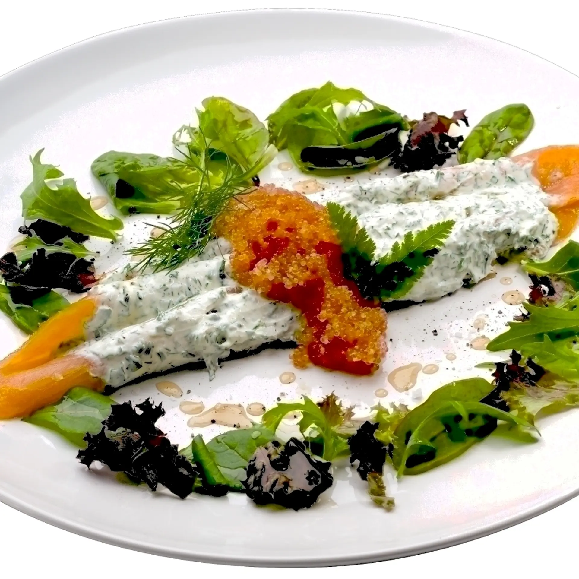 Fyldt røget lakseskive med stenbiderrogn, friske krydderurter og græsk yoghurt