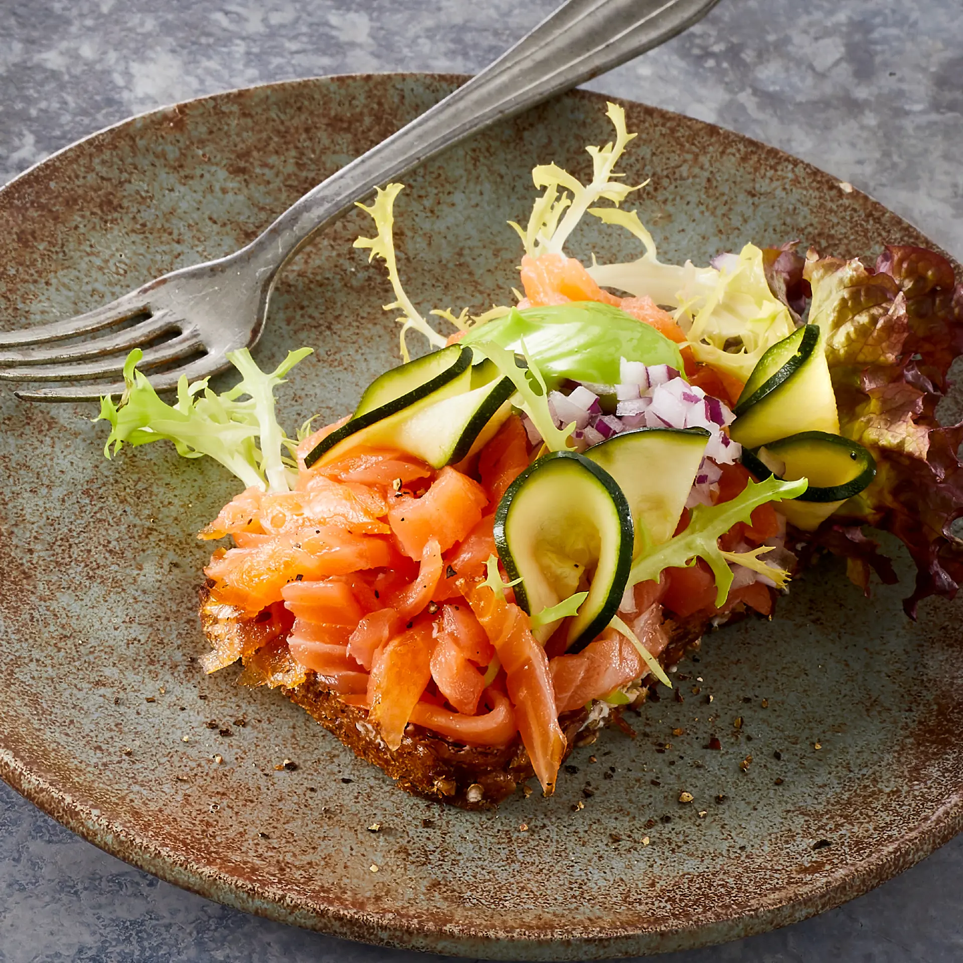 Tykke skiver af koldrøget laks i kombination med udvalg af løg syltet med appelsin, honning og kommen