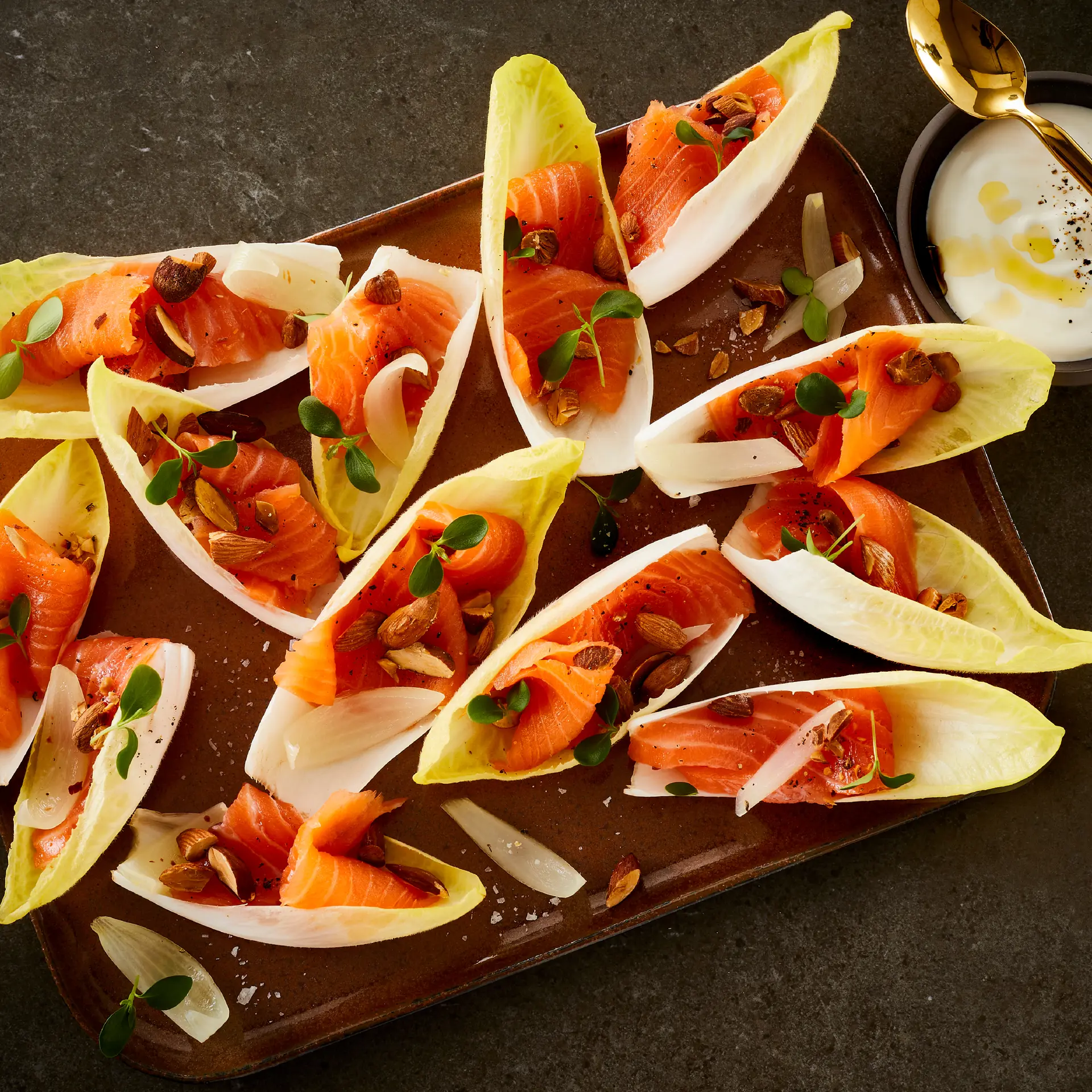 Læs opskrift : Sammenkomst af rimmet og røget laks med julesalat og salatløg i citronlage, samt saltbagte mandler
