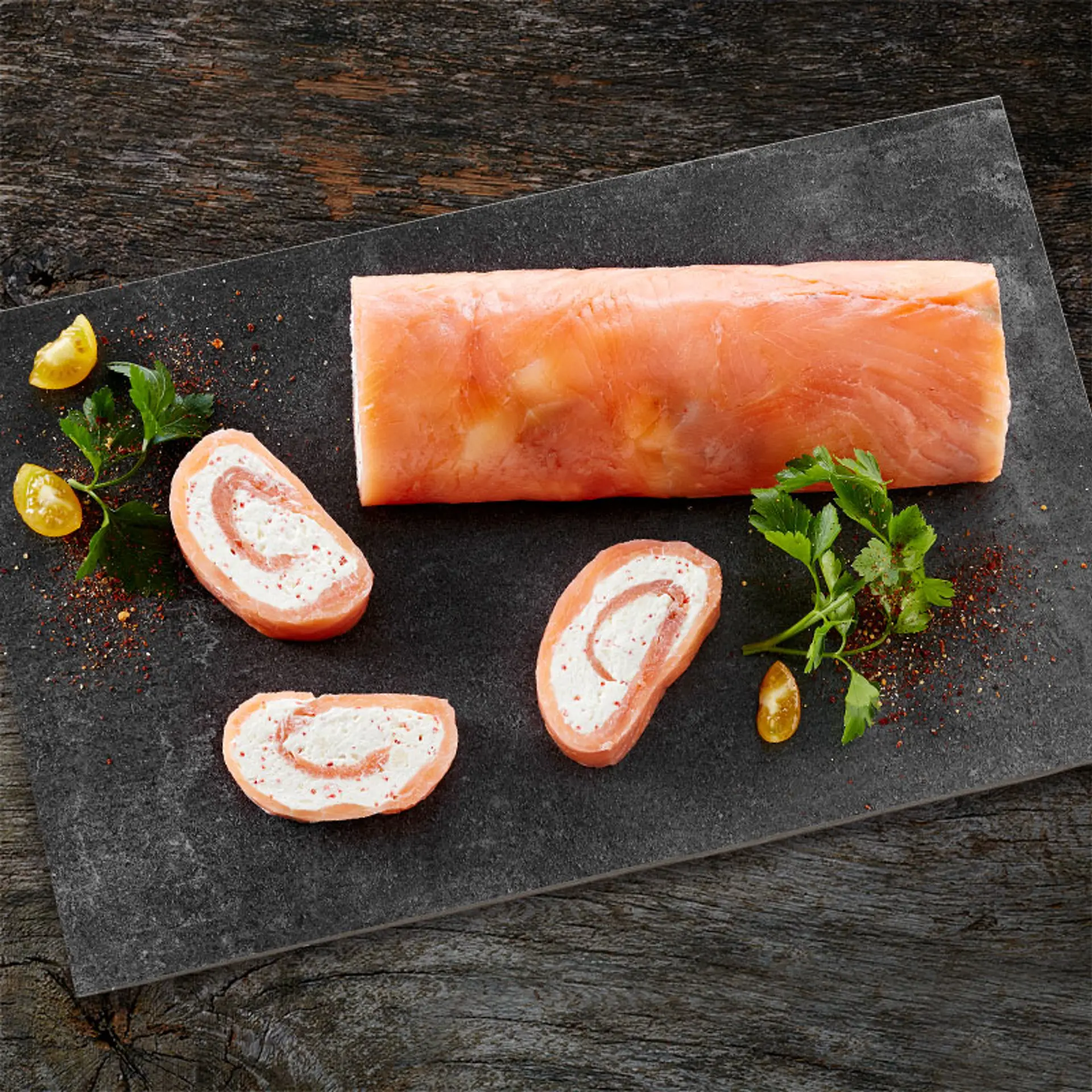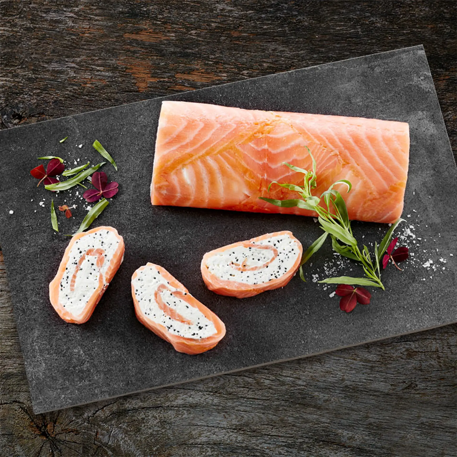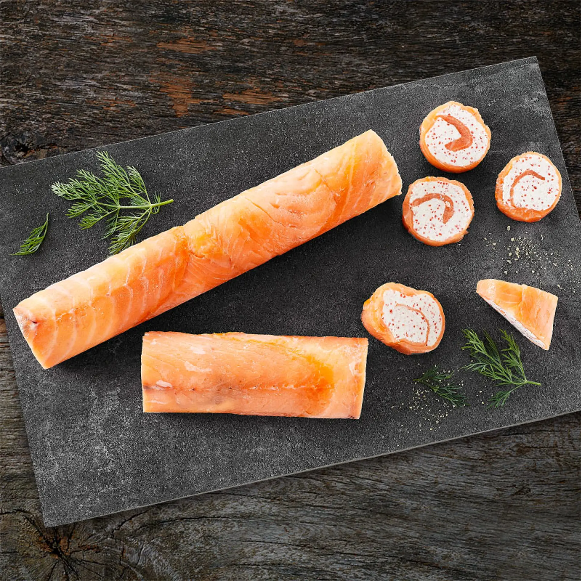 Røget lakseroulade med flødeost og sort tang-kaviar 1000 g