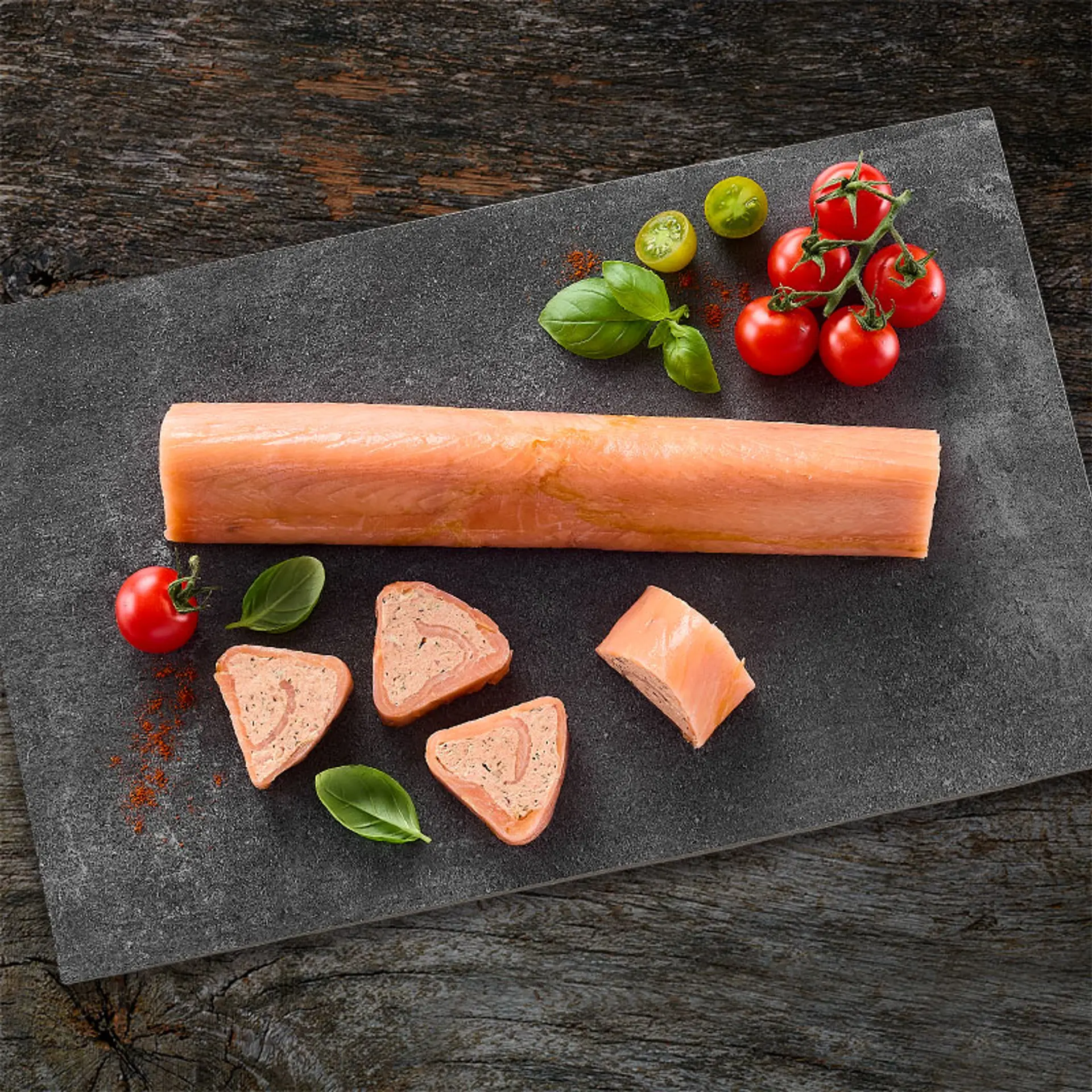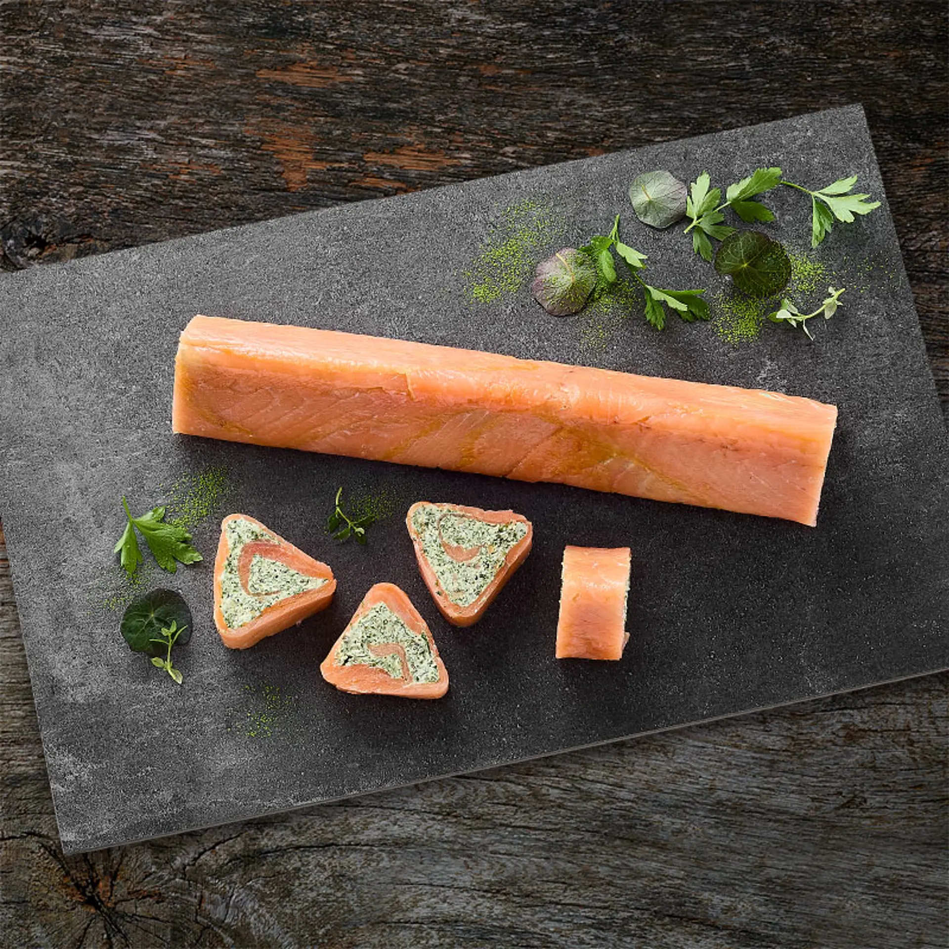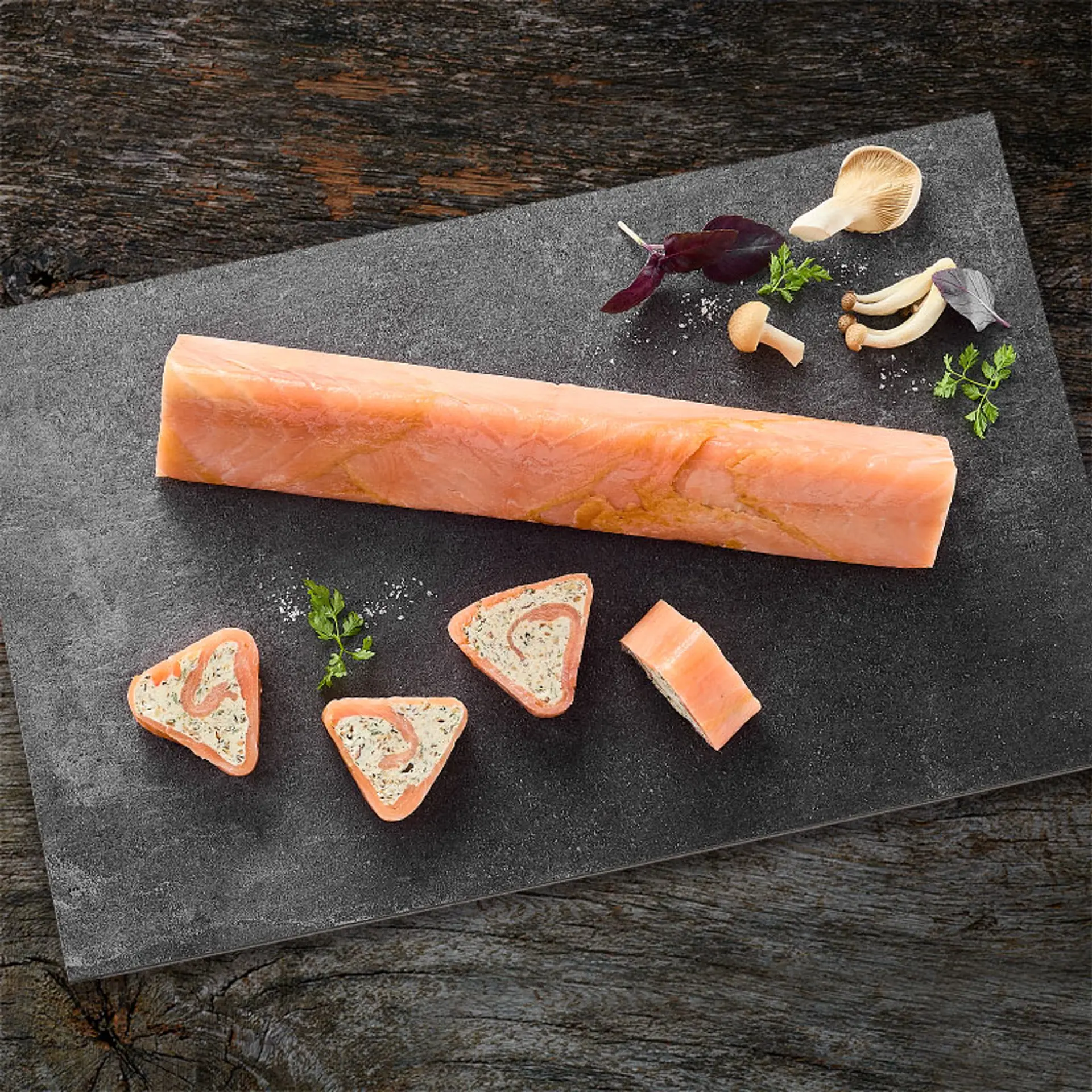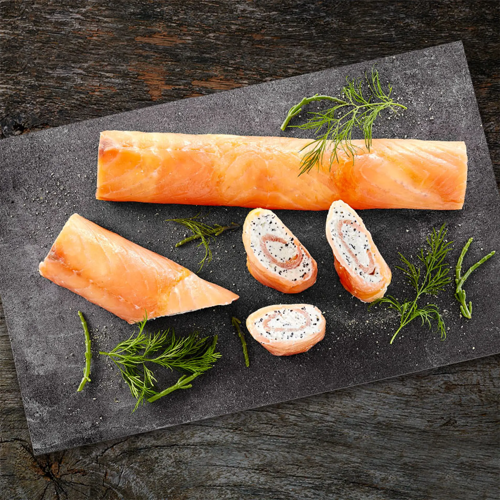 Røget lakseroulade med flødeost og sort tang-kaviar 1000 g